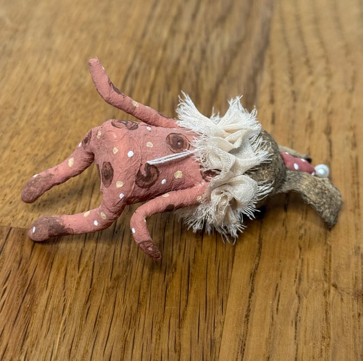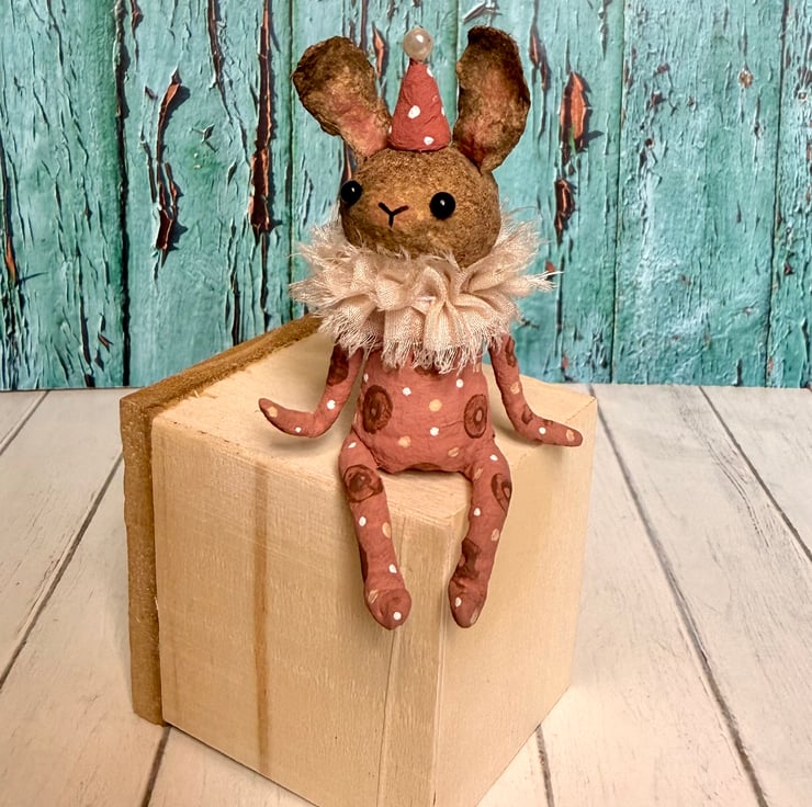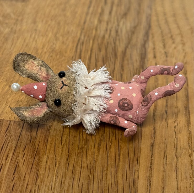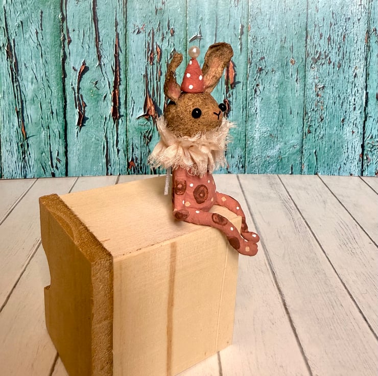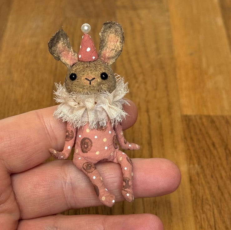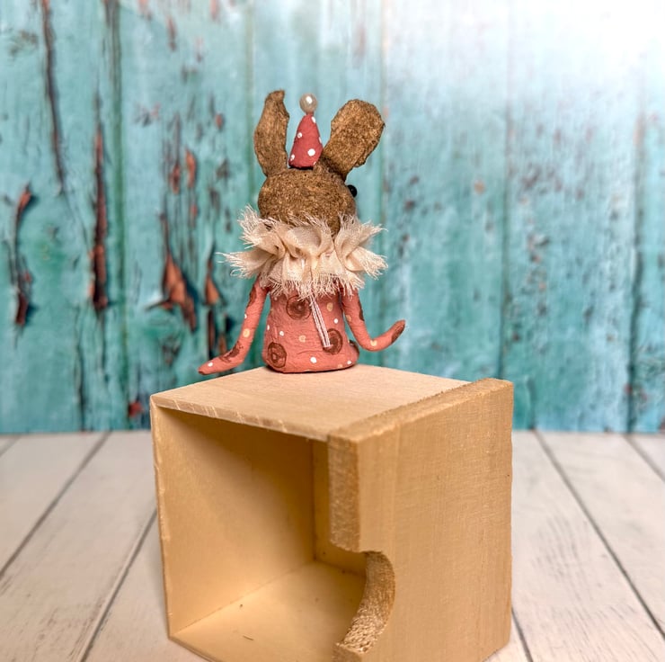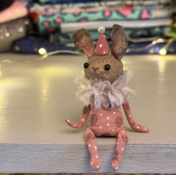 This little character sits peacefully atop a frame or on a shelf to keep you company. Made from spun cotton and completely hand painted, each one is unique. Rabbit has glass bead eyes and pink bead atop its hat. Rabbit wears a chiffon ruffle around the neck. Rabbit is decorated with polka dots and wears a party hat. Measures roughly 7cm tall and comes gift wrapped and sent in recyclable or recycled packaging. This is for decorative purposes only and not a toy.