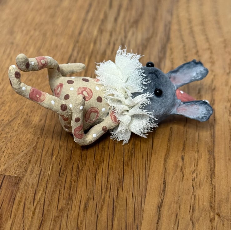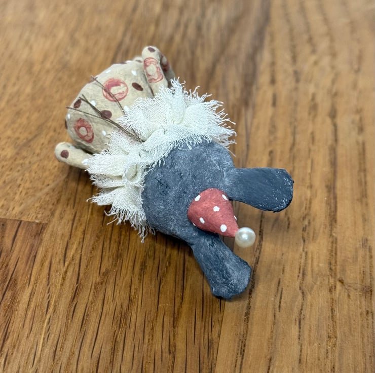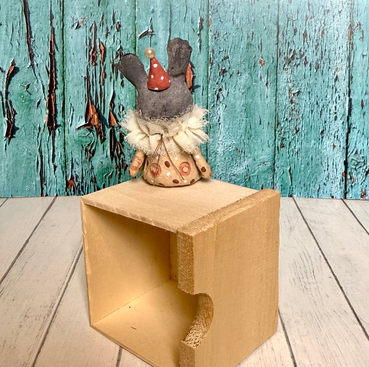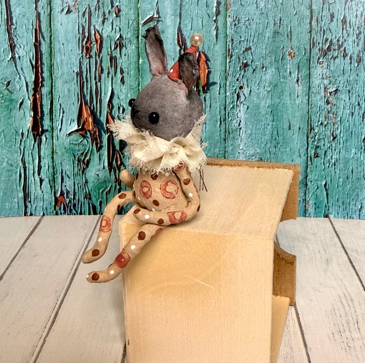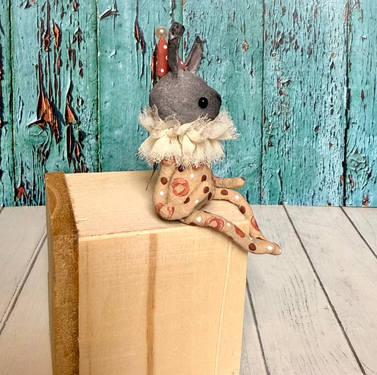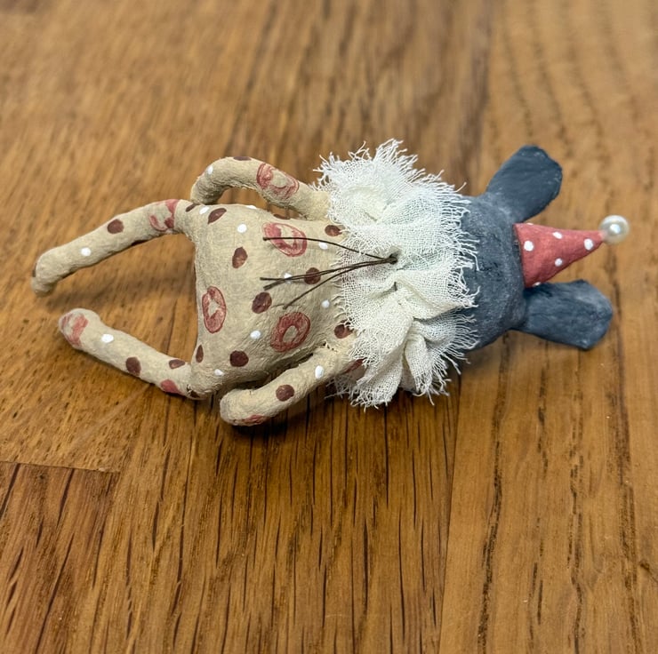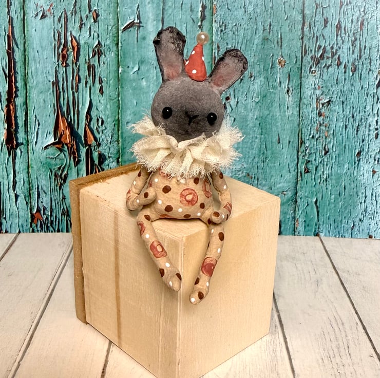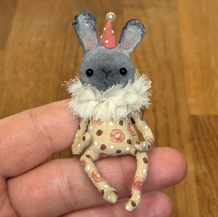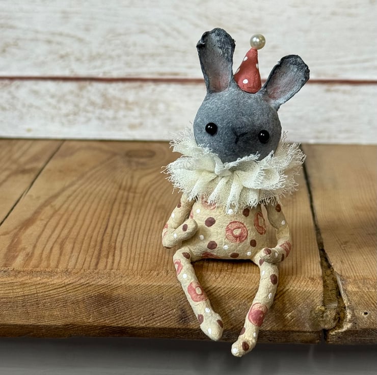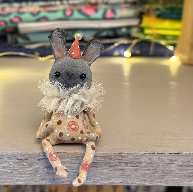 This little character sits peacefully atop a frame or on a shelf to keep you company. Made from spun cotton and completely hand painted, each one is unique. Rabbit has glass bead eyes and pink bead atop its hat. Rabbit wears a chiffon ruffle around the neck. Rabbit is decorated with polka dots and wears a party hat. Measures roughly 7cm tall and comes gift wrapped and sent in recyclable or recycled packaging. This is for decorative purposes only and not a toy.