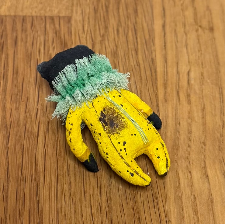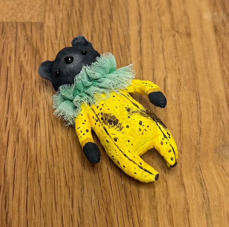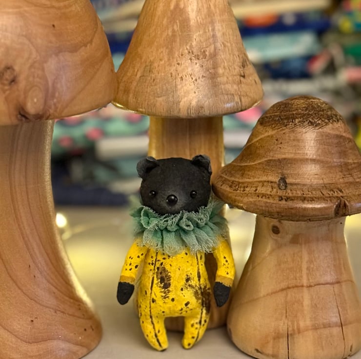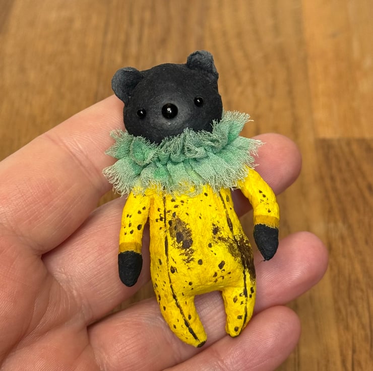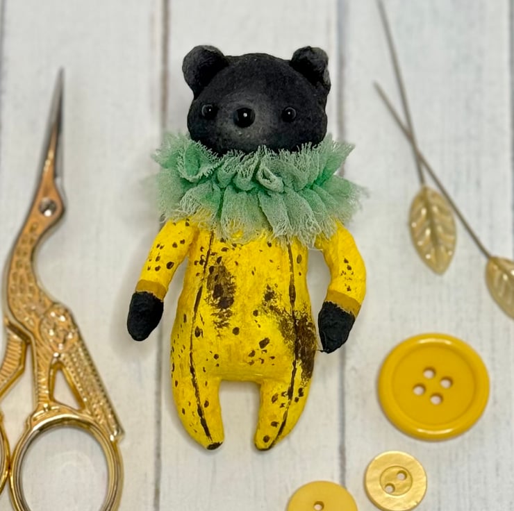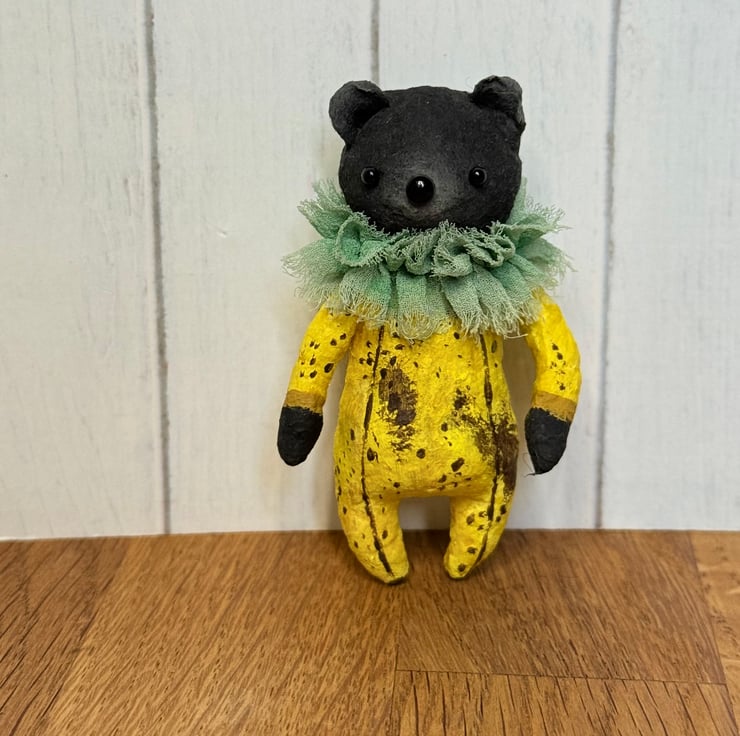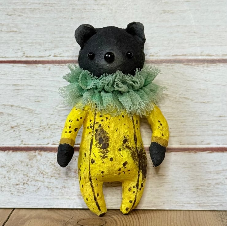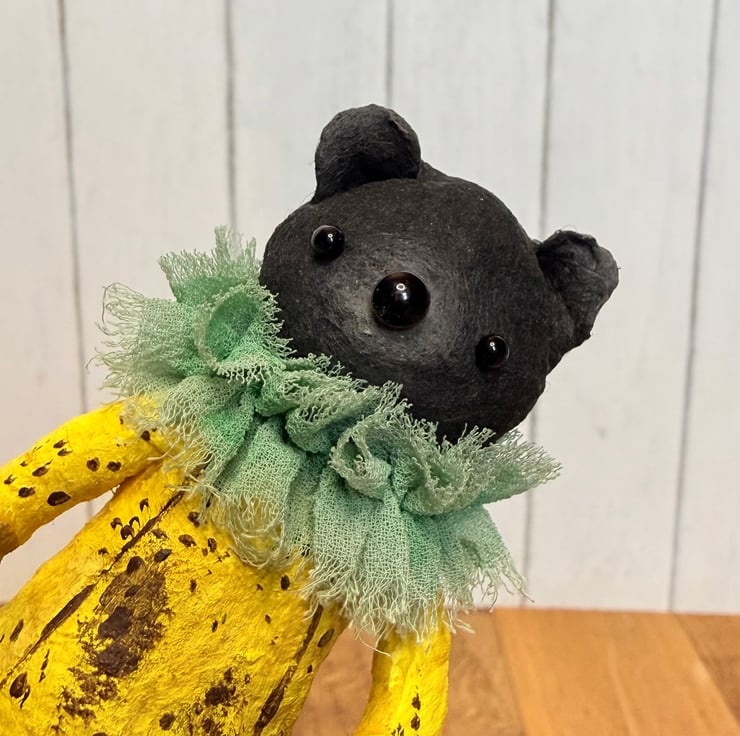 Little Black bear art doll with glass bead eyes and nose. Bear wears a soft frayed chiffon ribbon ruffle hand painted leafy green. Bear is completely hand painted and can come with transparent loop hanger.
