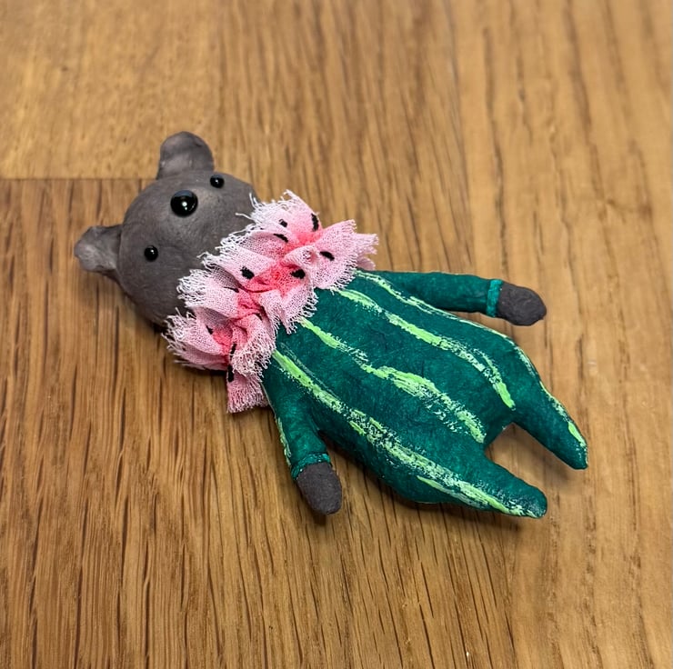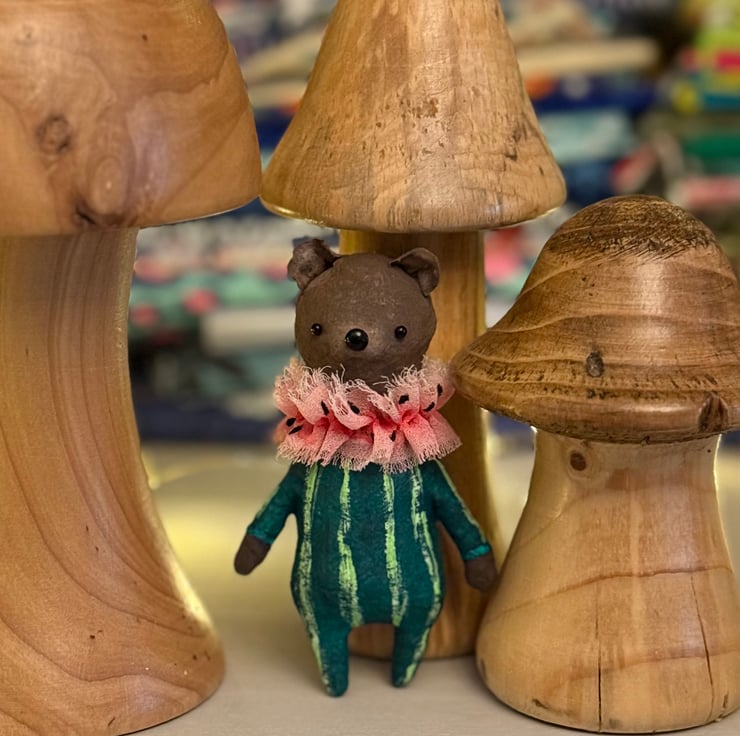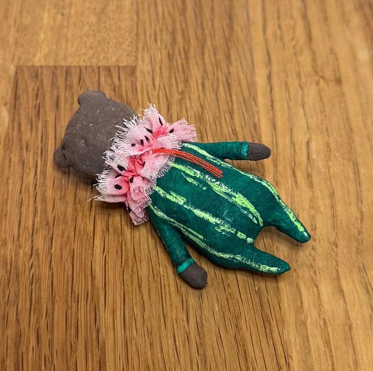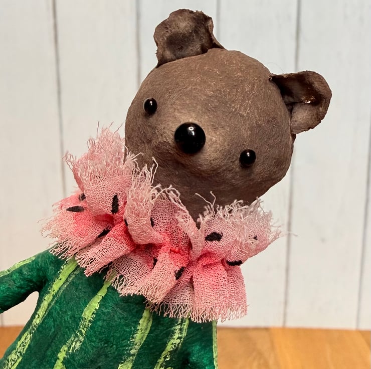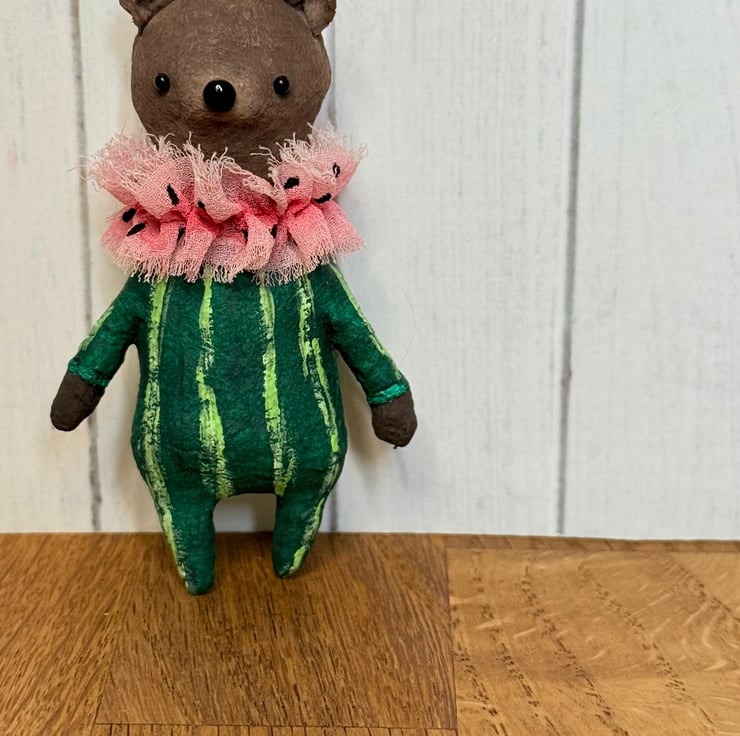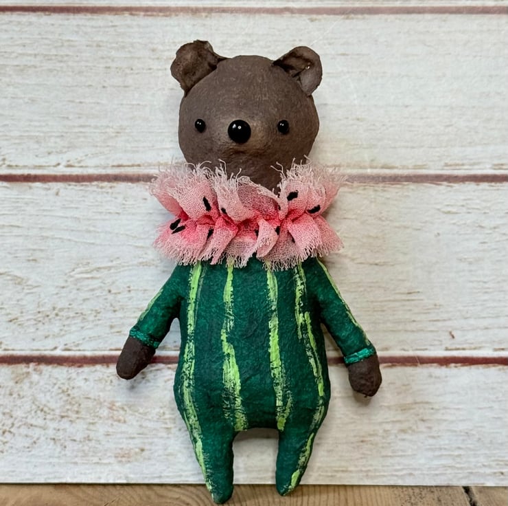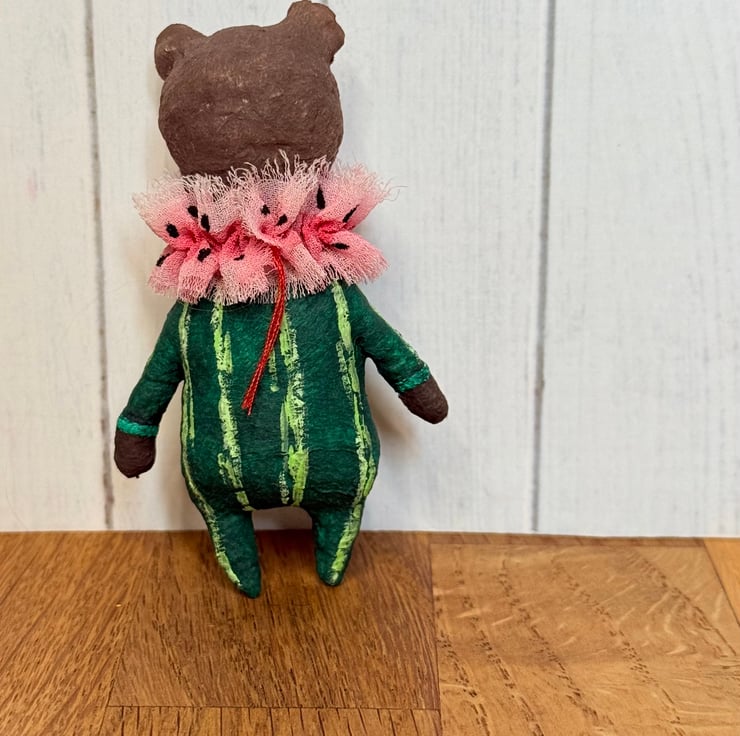 Little Brown bear art doll with glass bead eyes and nose. Bear wears a soft frayed chiffon ruffle hand painted to look like the inside of watermelon . Bear is completely hand painted and can come with transparent loop hanger.