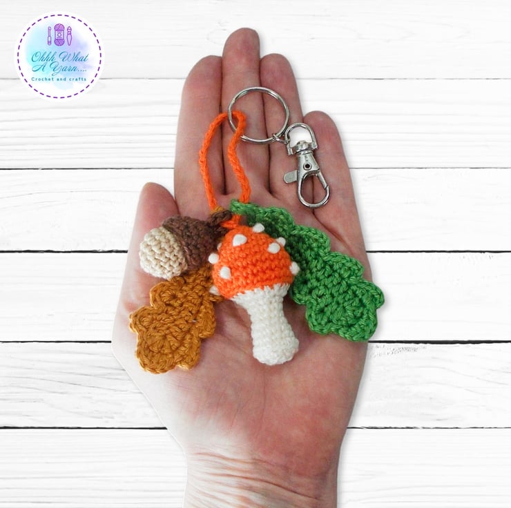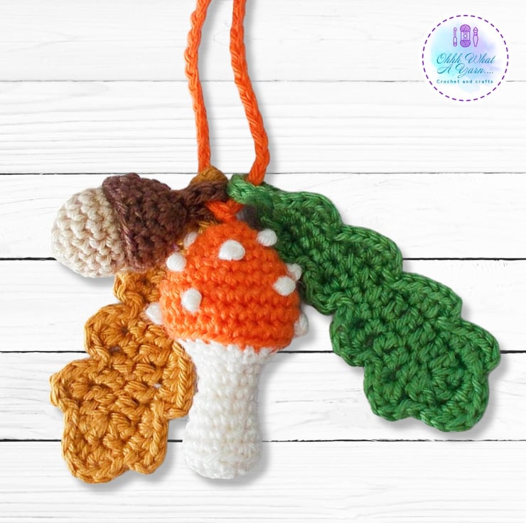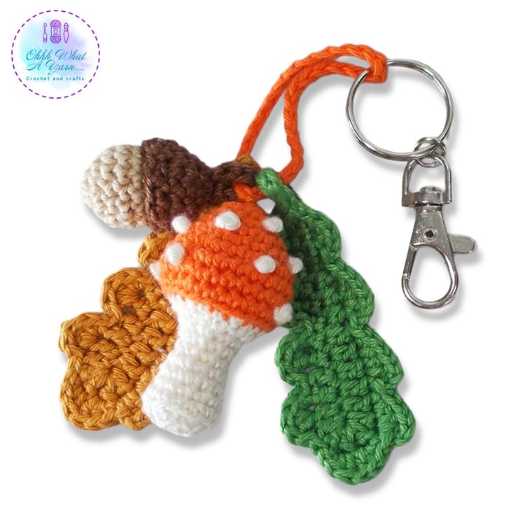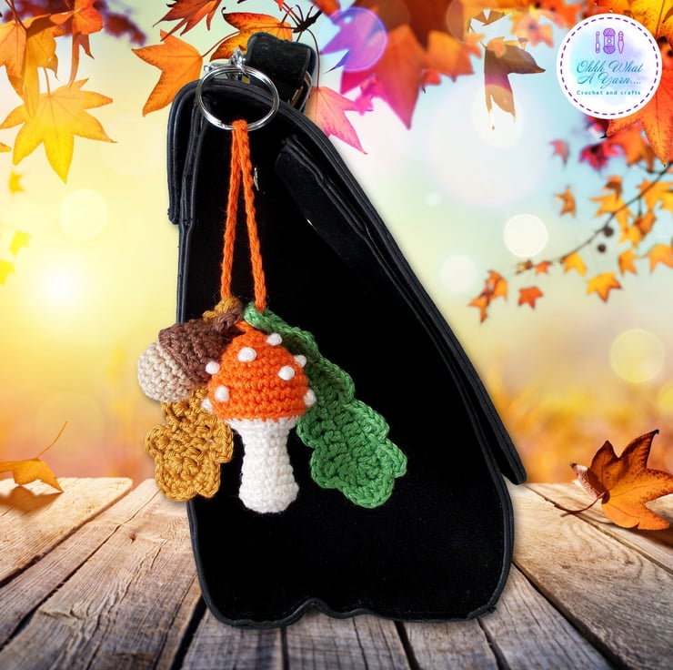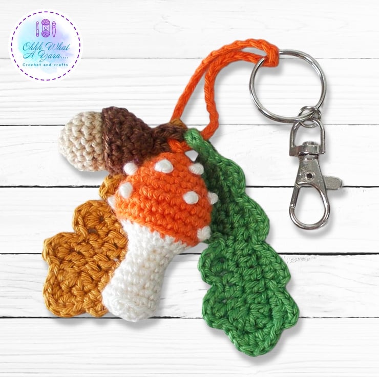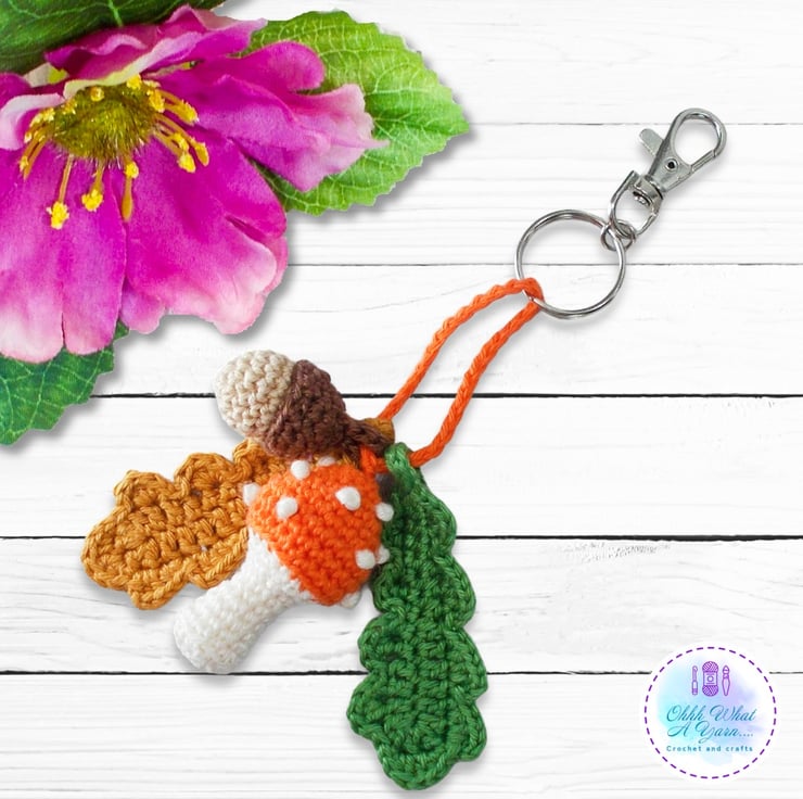 This gorgeous bag charm has been crocheted using premium mercerised cottons which give it a lovely sheen and stitch definition. it has an orange crochet toadstool, an acorn and two crochet oak leaves.
