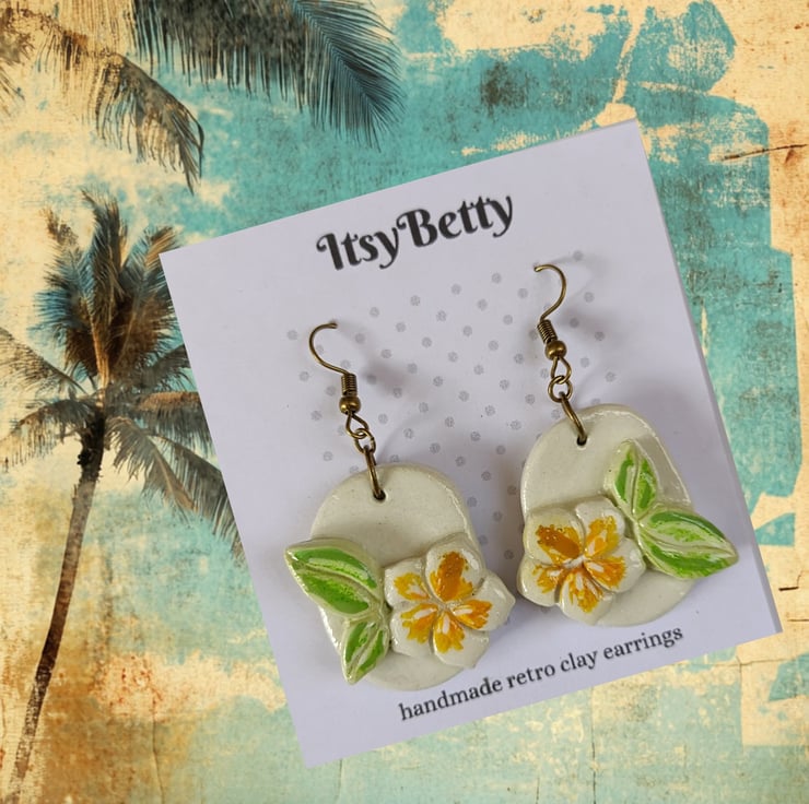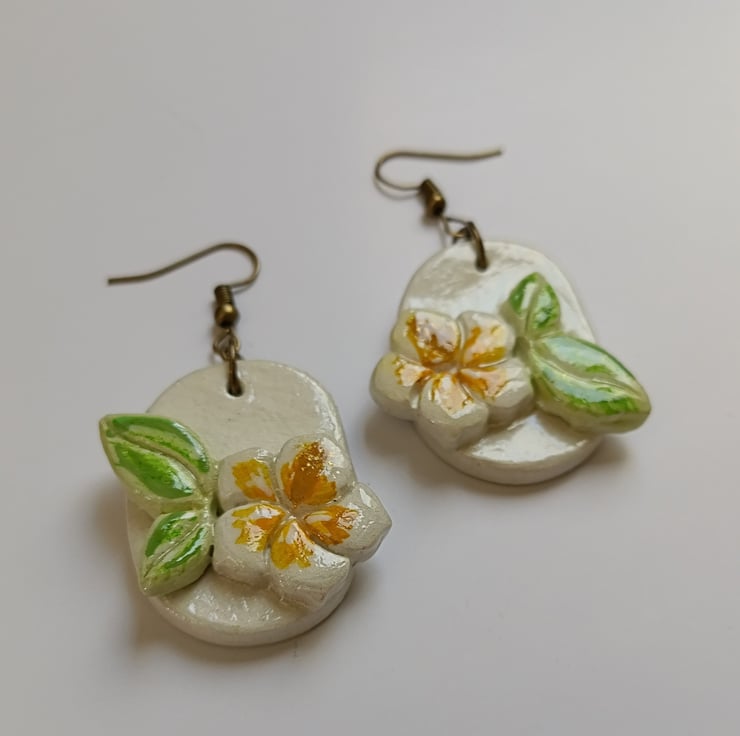 These earrings are crafted from air dry clay, hand painted and varnished to give a ceramic-like finish. Completed with hypoallergenic antique bronze effect ear wires and plastic backs.