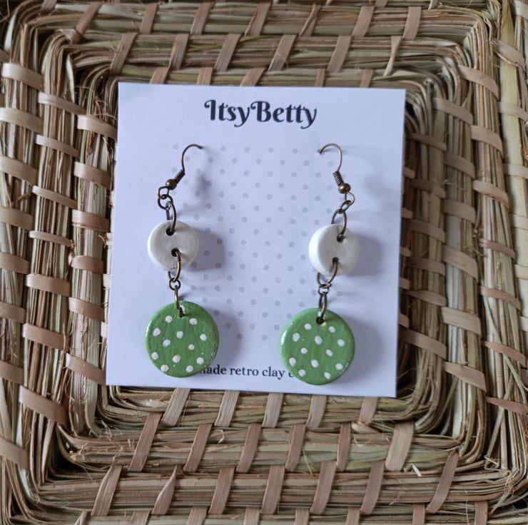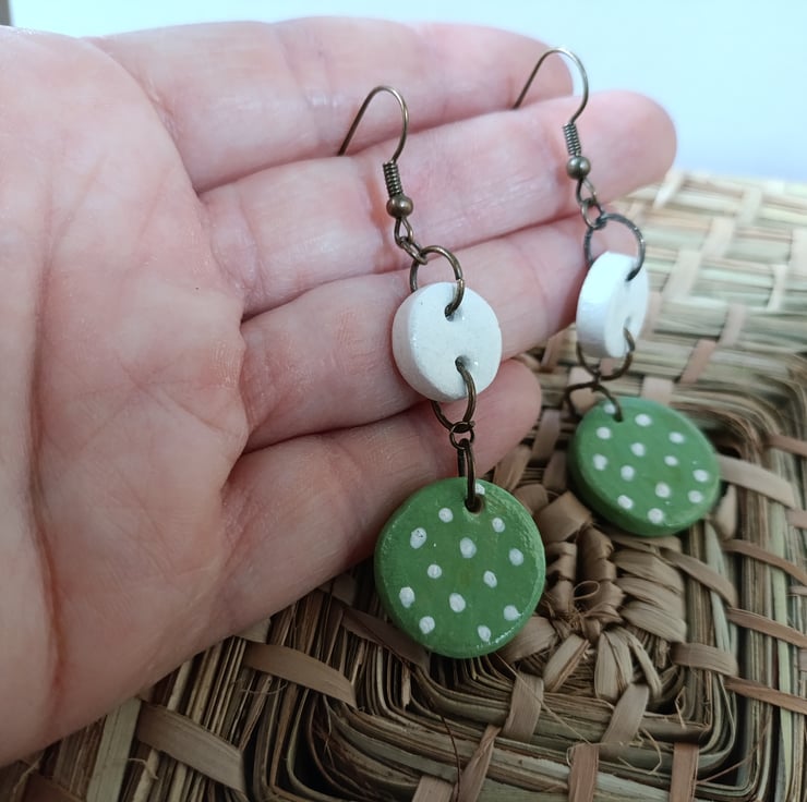 These earrings are crafted from air dry clay, then hand painted and varnished. Completed with antique bronze effect ear wires and plastic backs.
