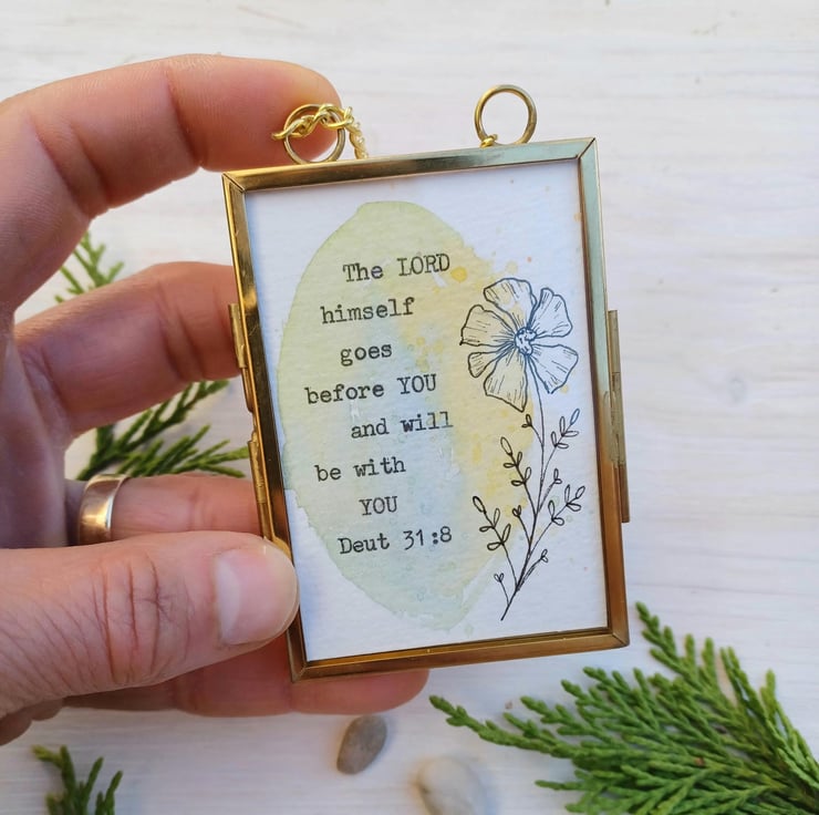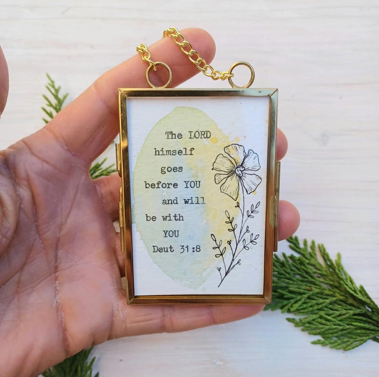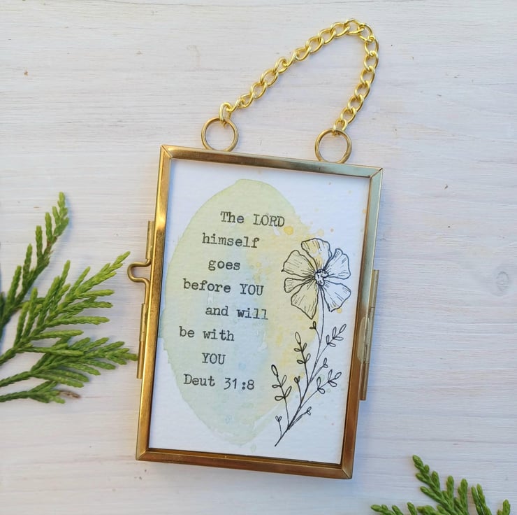 This is a mini hand painted water colour, bible scripture quote, encouragement Gift, with a beautiful hand drawn flower illustration. Presented in this lovely little gold metal and glass hanging frame.