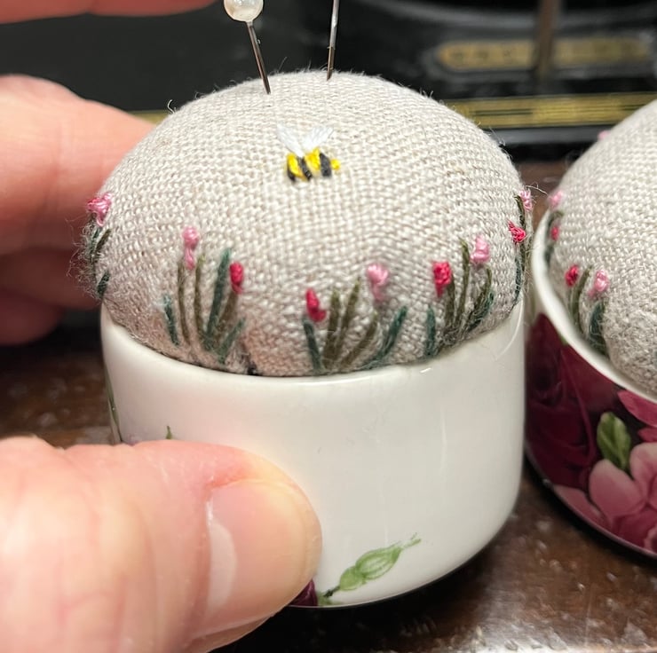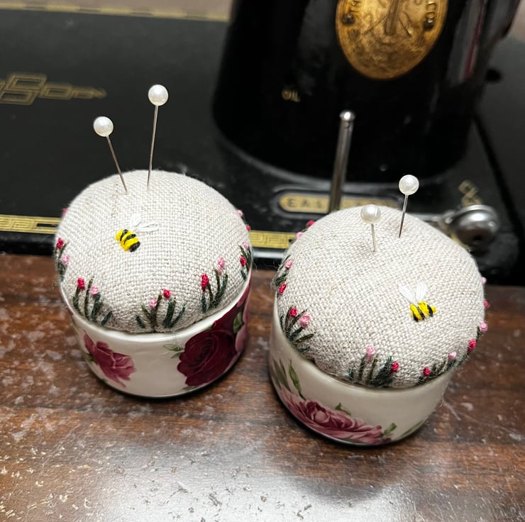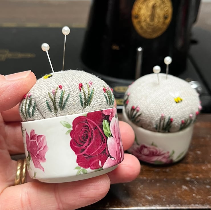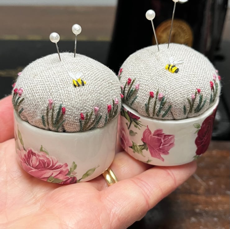 Sweet little pair of embroidered pincushions in two small rose print dishes. The reclaimed linen cushion has been embroidered with tiny flowers and a bee.