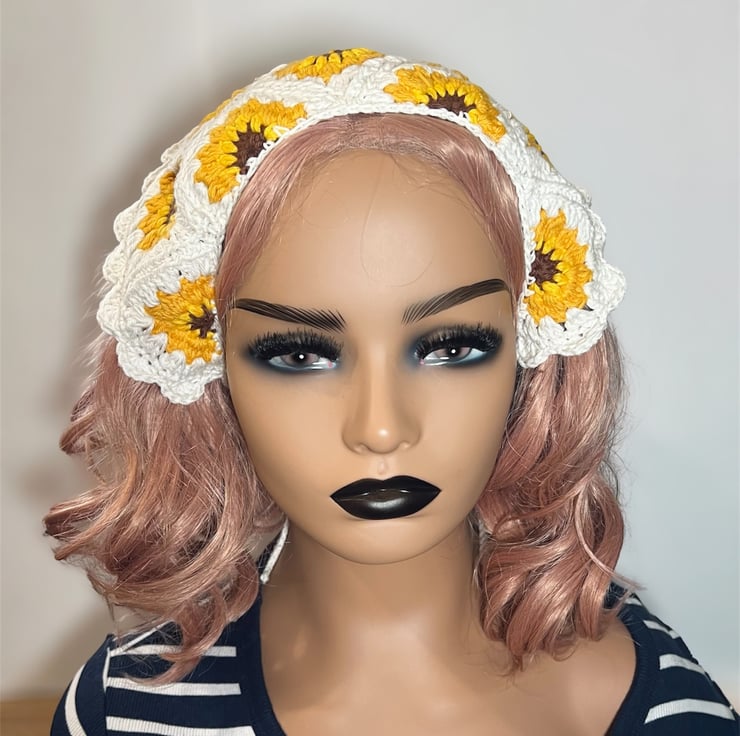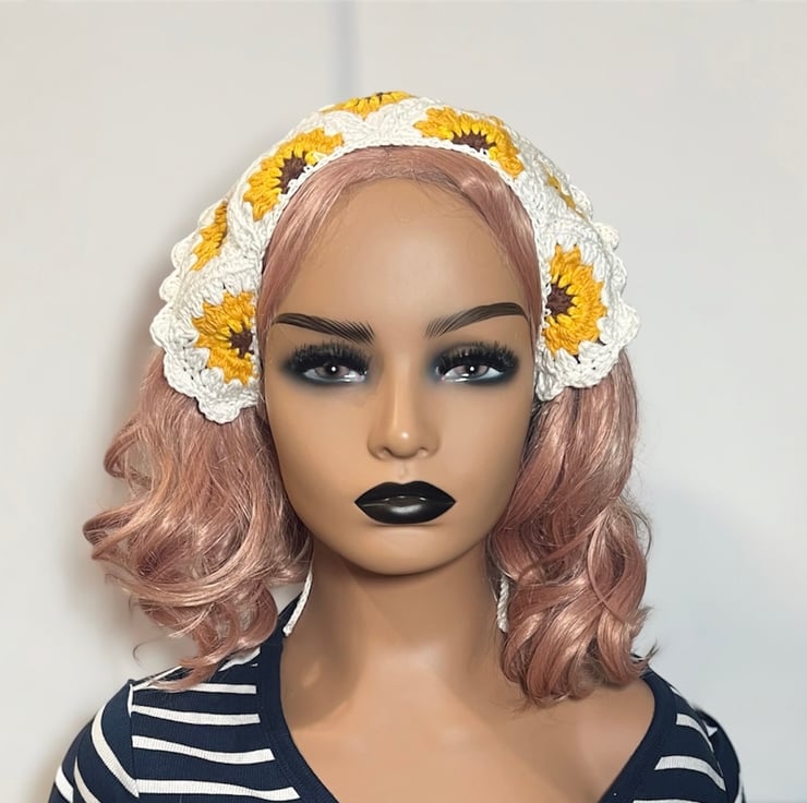 Bring a touch of summer to your wardrobe with this vibrant, hand-crocheted sunflower bandana. Meticulously handcrafted using 100% premium cotton yarn, this bohemian-style hair accessory features a classic granny square design with cheerful sunflowers at its heart. Whether you're heading to a summer festival, a cottagecore-inspired picnic, or simply need a stylish way to keep your hair back, this breathable and lightweight kerchief is the perfect handmade addition to your collection.