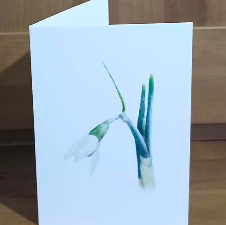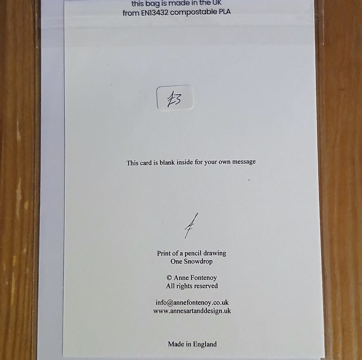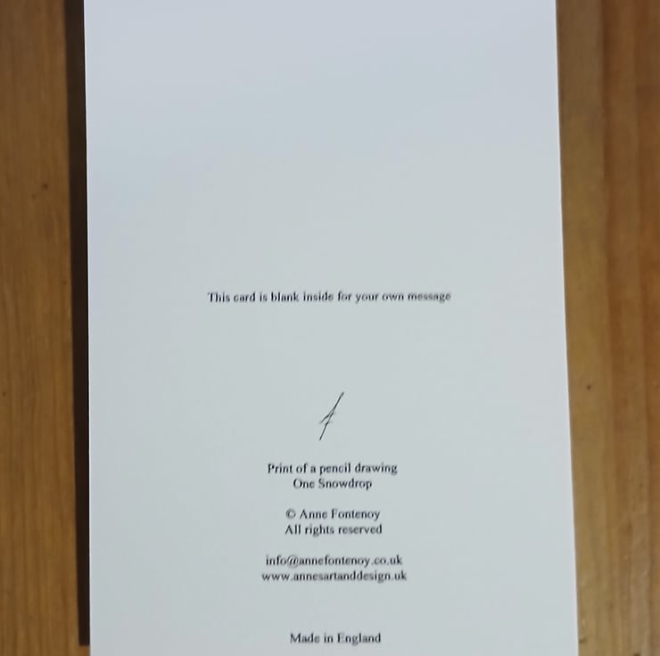 This One Snowdrop card is a print of one of my pencil drawings. The original is on A4 130 gsm smooth cartridge paper and is also for sale, unmounted for £180 (last photo).