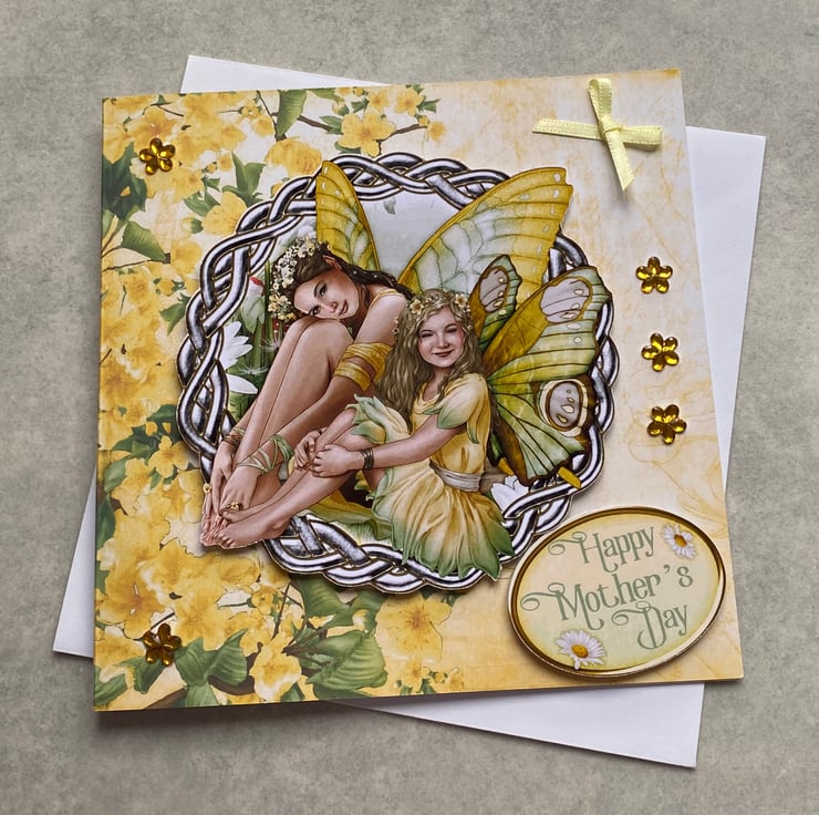 The card is embelleshed with acrylic flowers and a single yellow satin ribbon.