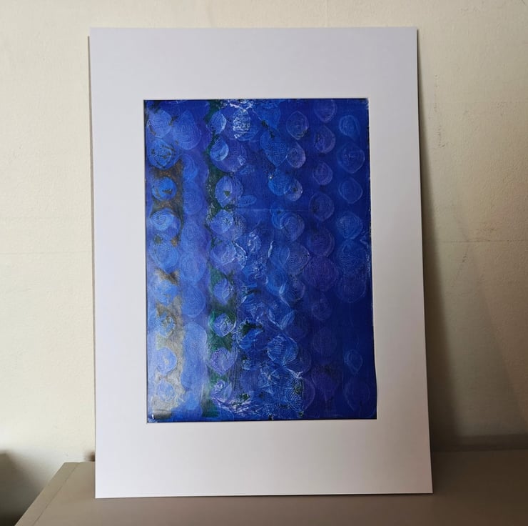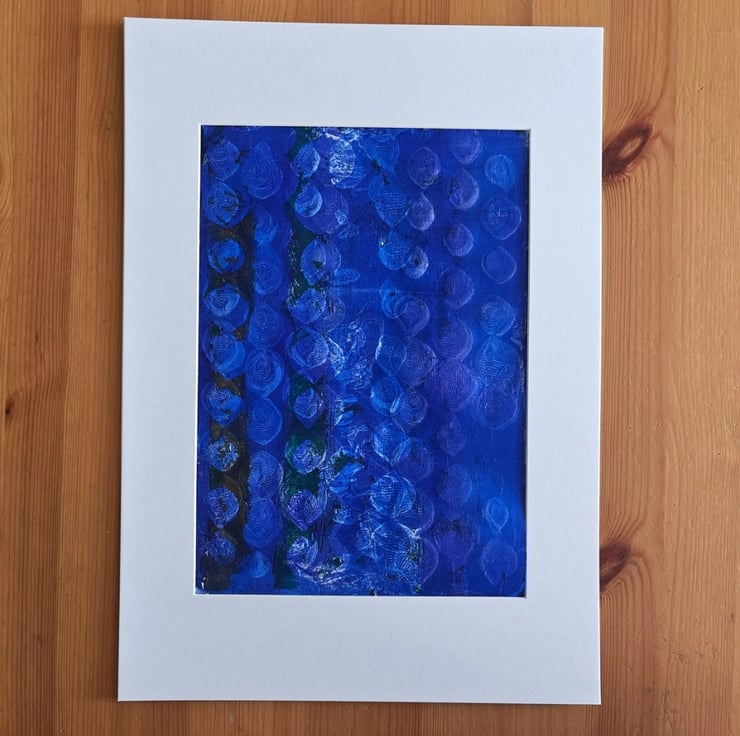 A monoprint with layers in deep blue and purple. The print is A4 in size and is presented in an A3 card mount ready for framing.