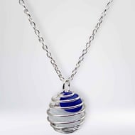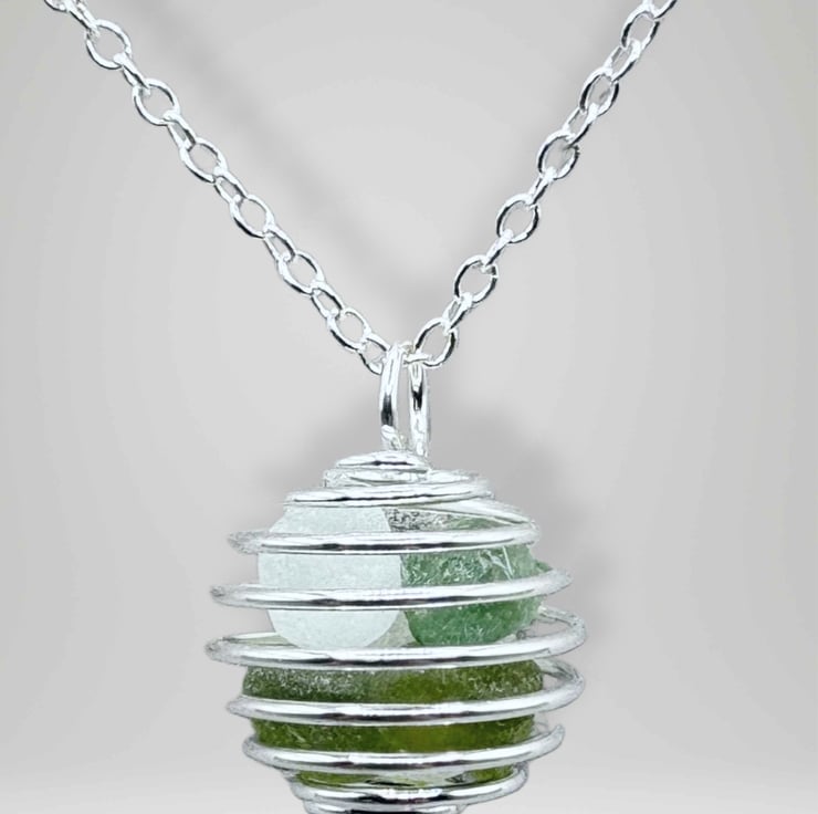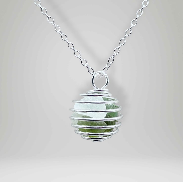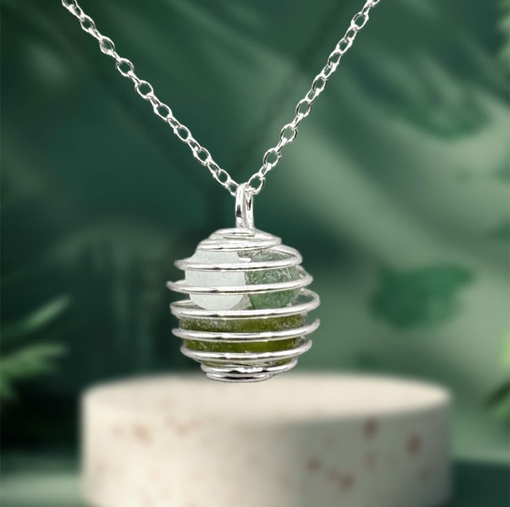 Sea glass bubbles in a silver plated spiral cage necklace.