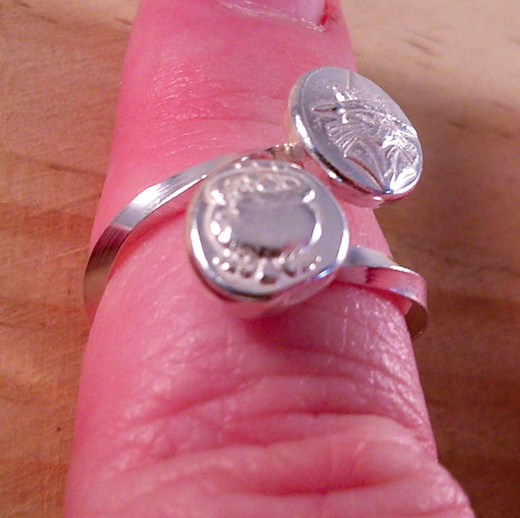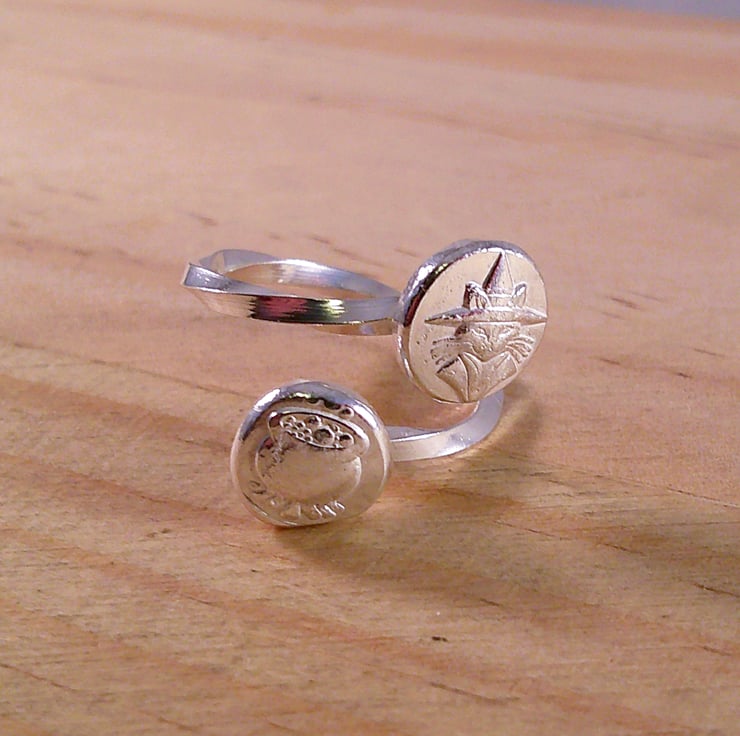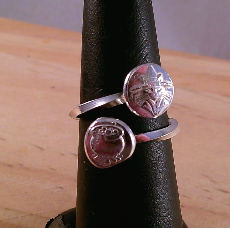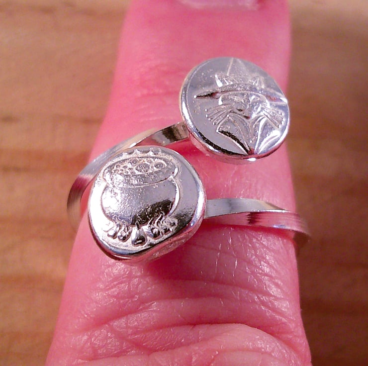 Scrap sterling silver has been melted into a ball and pressed into moulds of a cauldron and a cat in a witch's hat. The flattened balls have then been refined and soldered on to an adjustable ring band made from twisted square wire.