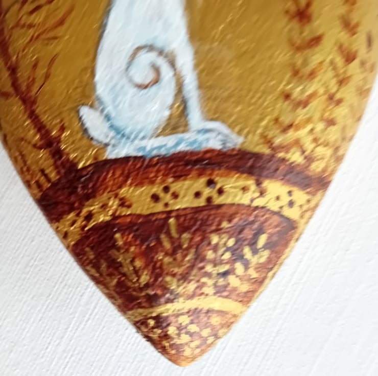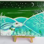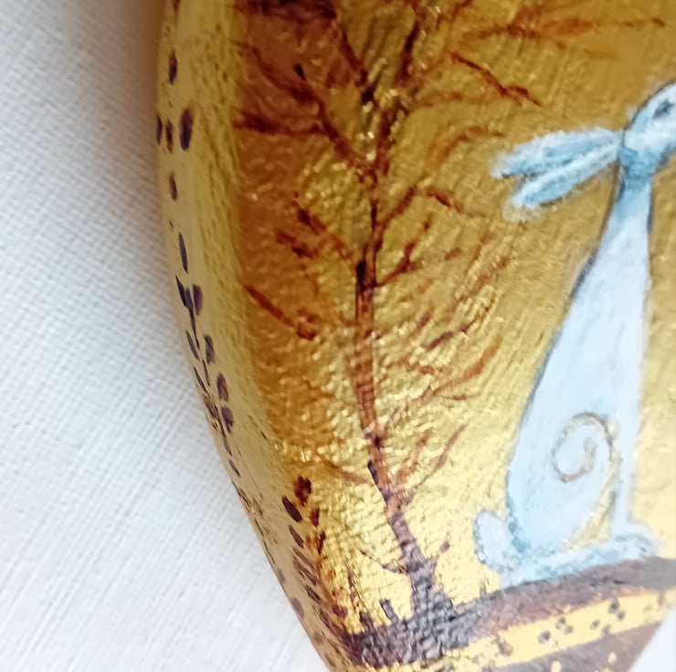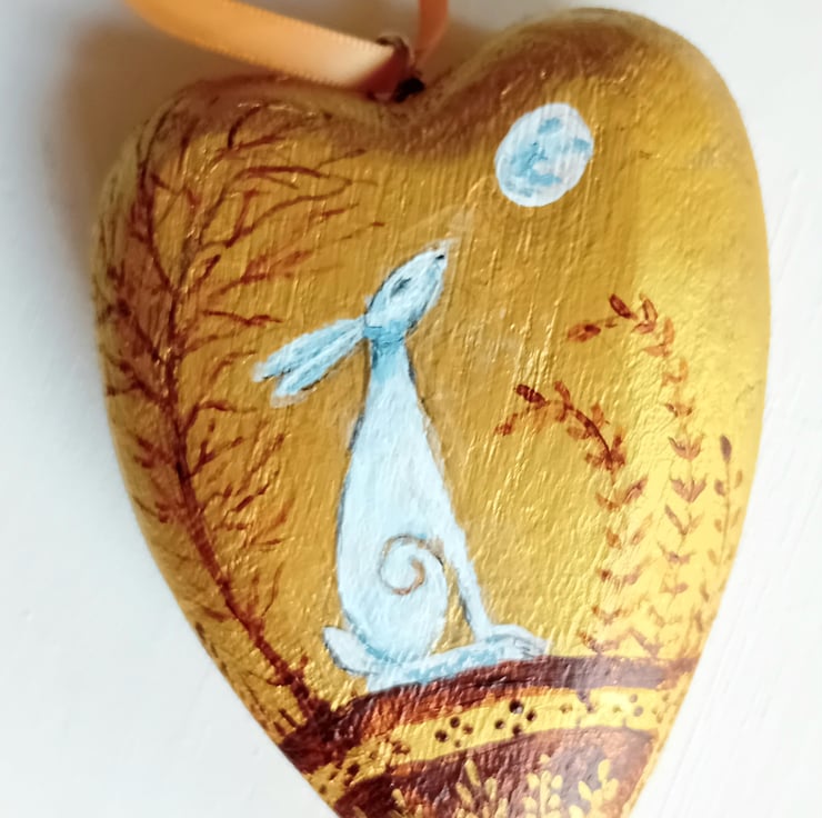 truly lovely chunky wooden heart shape showing a moongazing white hare trees and foliage it's ready to hang with a golden ribbon. 9 x 12 x 3 a beautiful gift for someone special