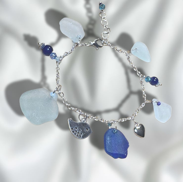 Sea glass charm bracelet blue, Seafoam & white pieces of seaglass. St