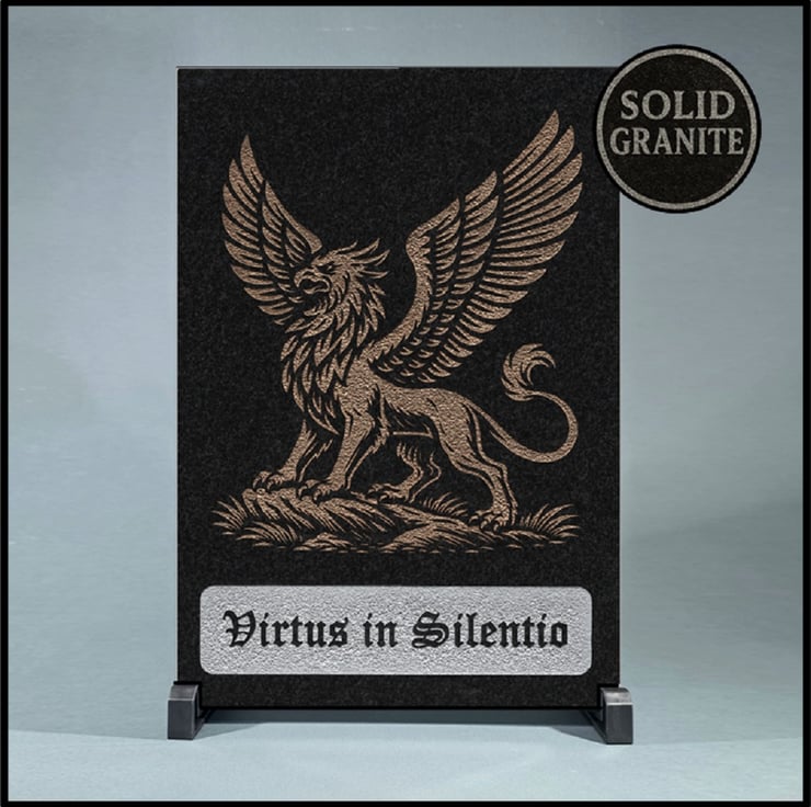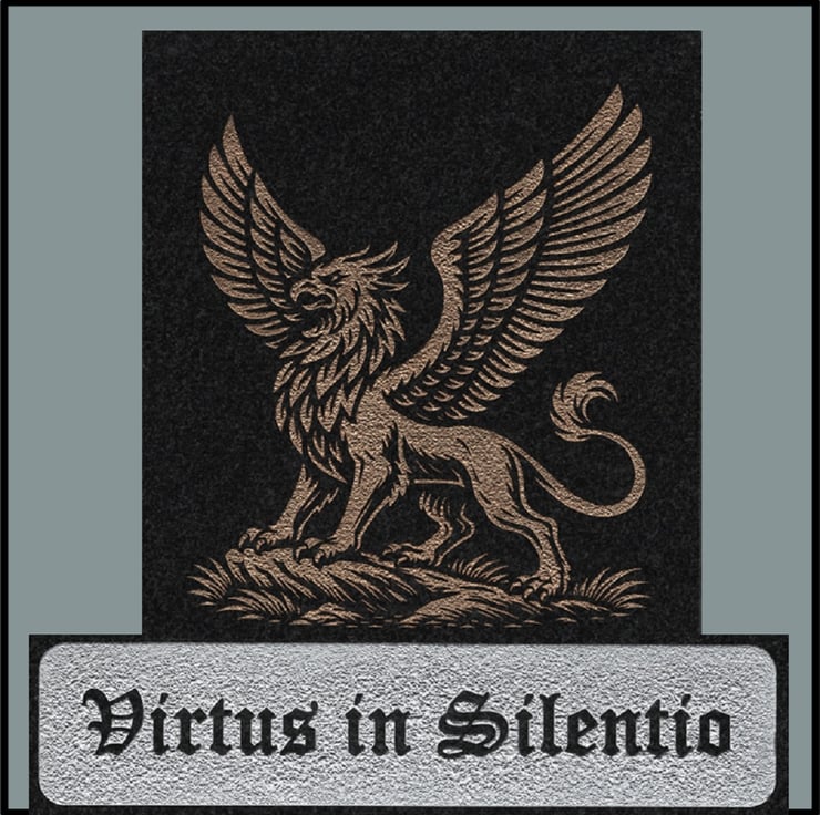 Beneath this noble creature, the Latin inscription Virtus in Silentio (“Strength in Silence”) is etched in Gothic script, inviting reflection and resilience. This piece offers a powerful reminder: true virtue often speaks in stillness.