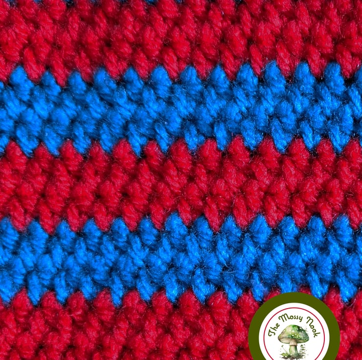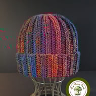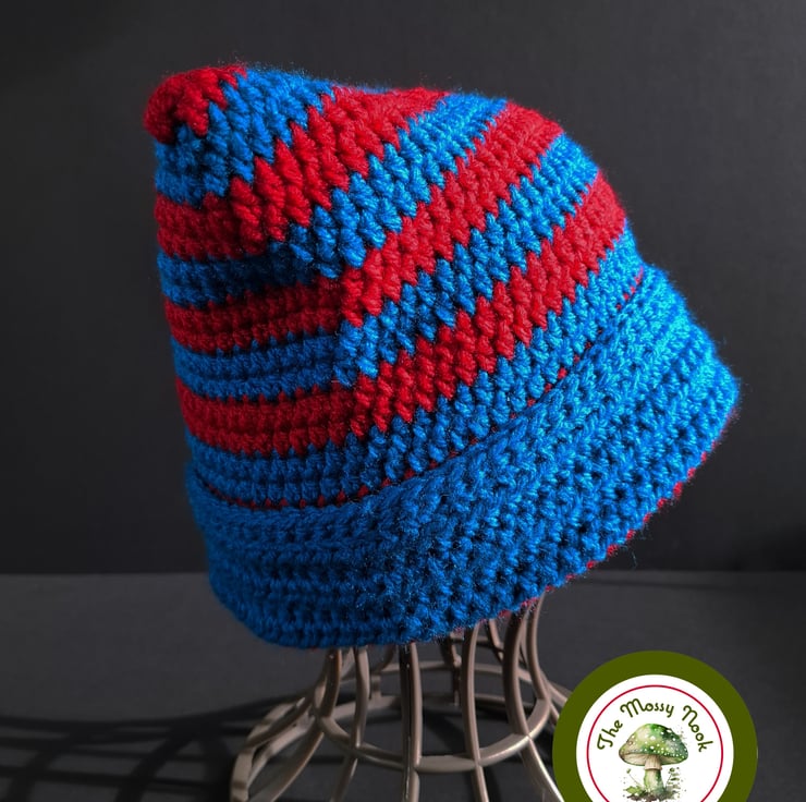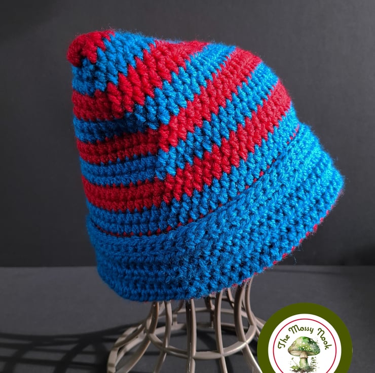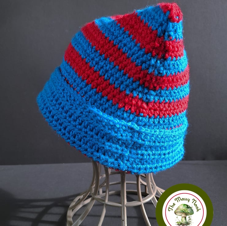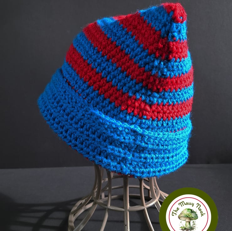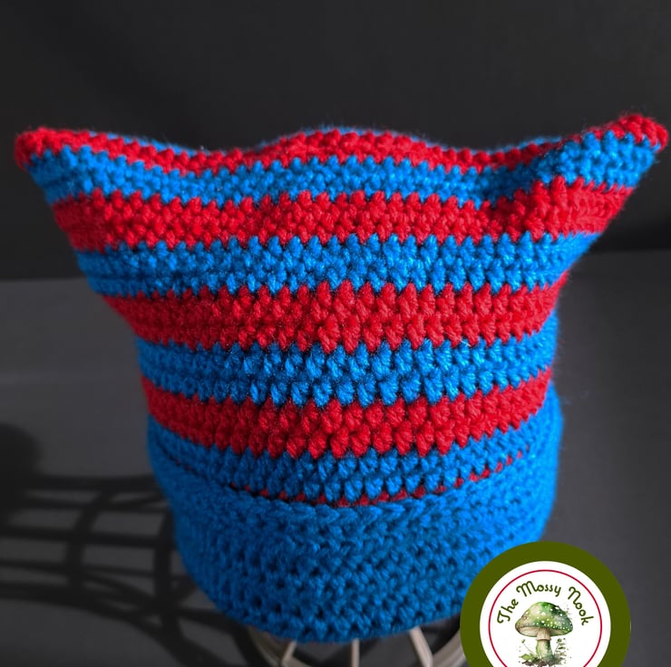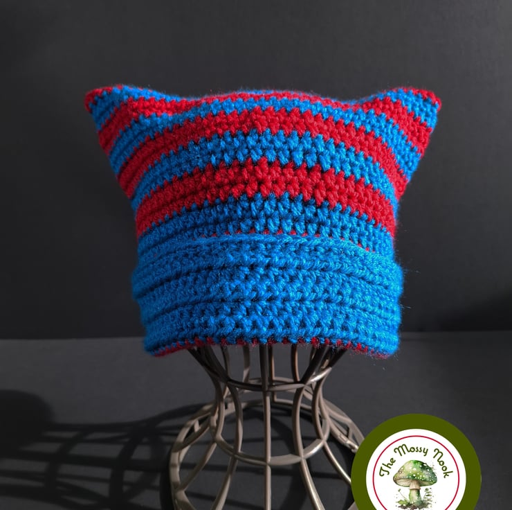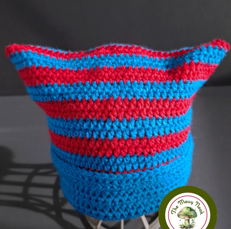 This cute cat ear hat is hand crocheted using a lovely soft, acrylic yarn in stipes of vibrant peacock blue and red. The cuff is not fixed, allowing you to shorten or lengthen the hat to your choosing