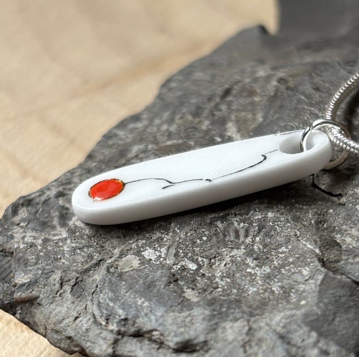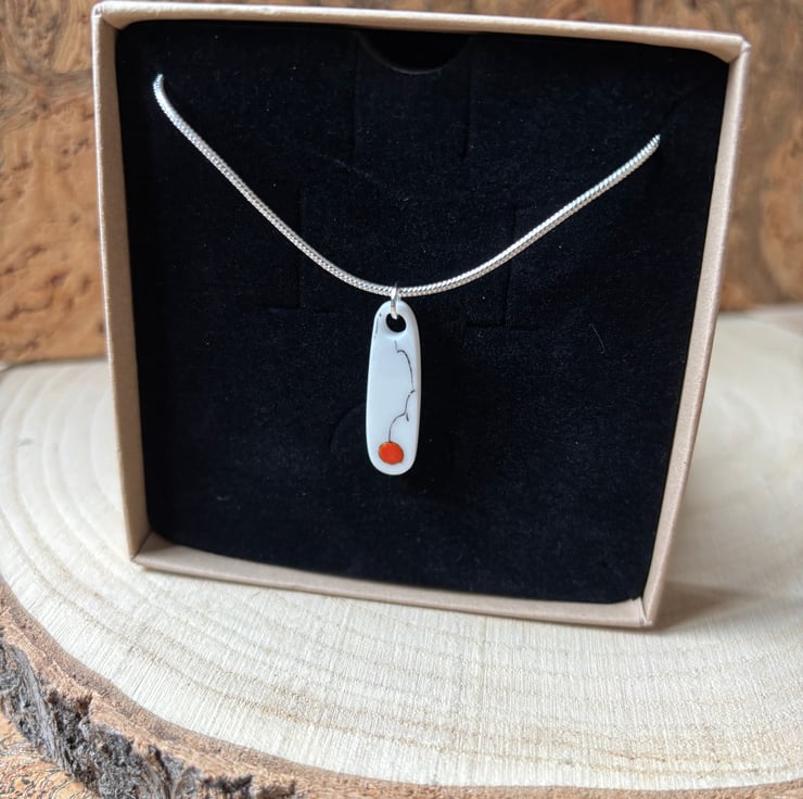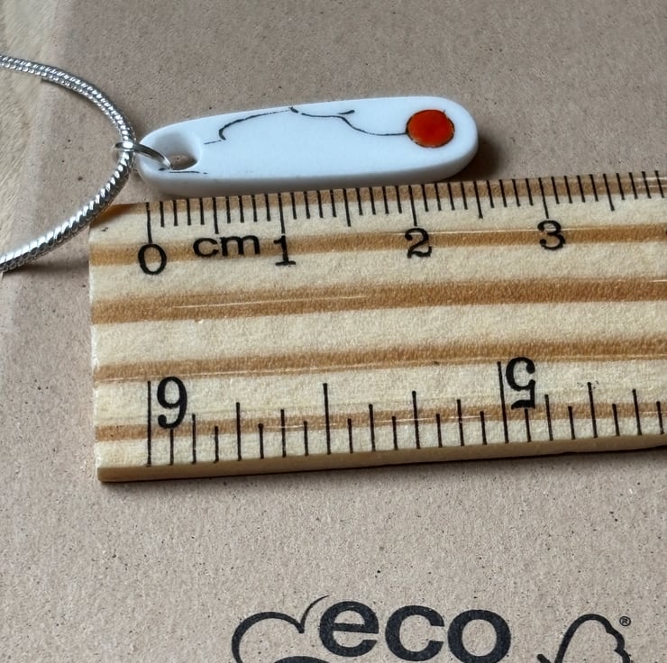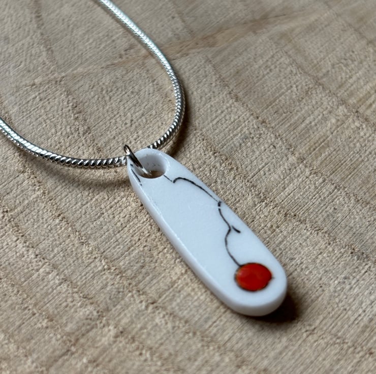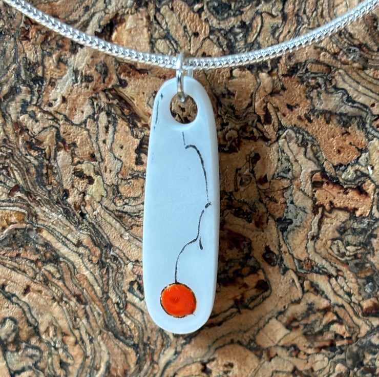 This pendant is made from the pattern on the rim of the plate, the hand painted orange dot originally part of the top of the design, forms the bottom of the pendant with wavy lines leading to the jump ring hole.