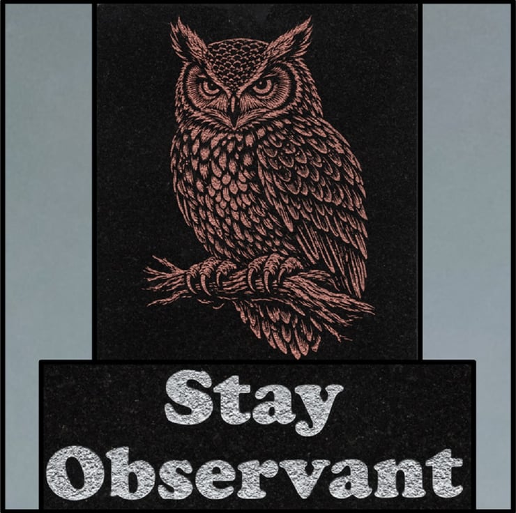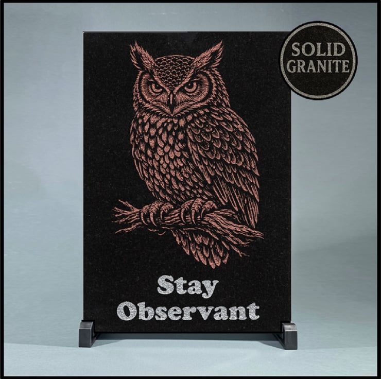 Measuring 210mm x 297mm, 10mm thick, and weighing about 1.5kg, this plaque features a striking illustration of a wise owl, painted in rich copper tones against a deep black background. The owl’s intense gaze evokes mystery, insight, and timeless watchfulness, making it a grounding and inspiring presence. Below the branch, the bold silver inscription “Stay Observant” serves as a daily reminder to trust your instincts, notice the details, and remain open to life’s subtle signals.