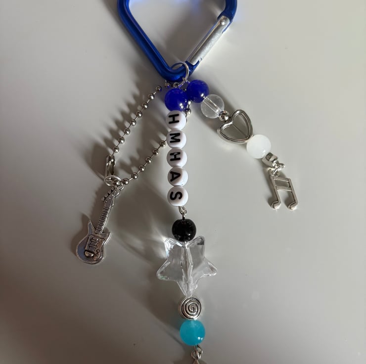 A handmade beaded and charmed keychain inspired by BE3!