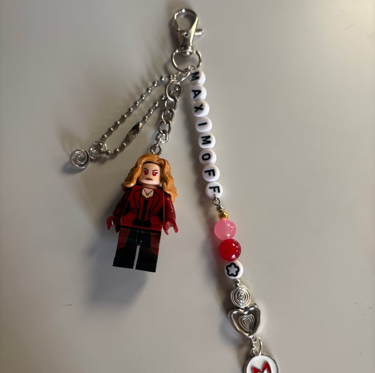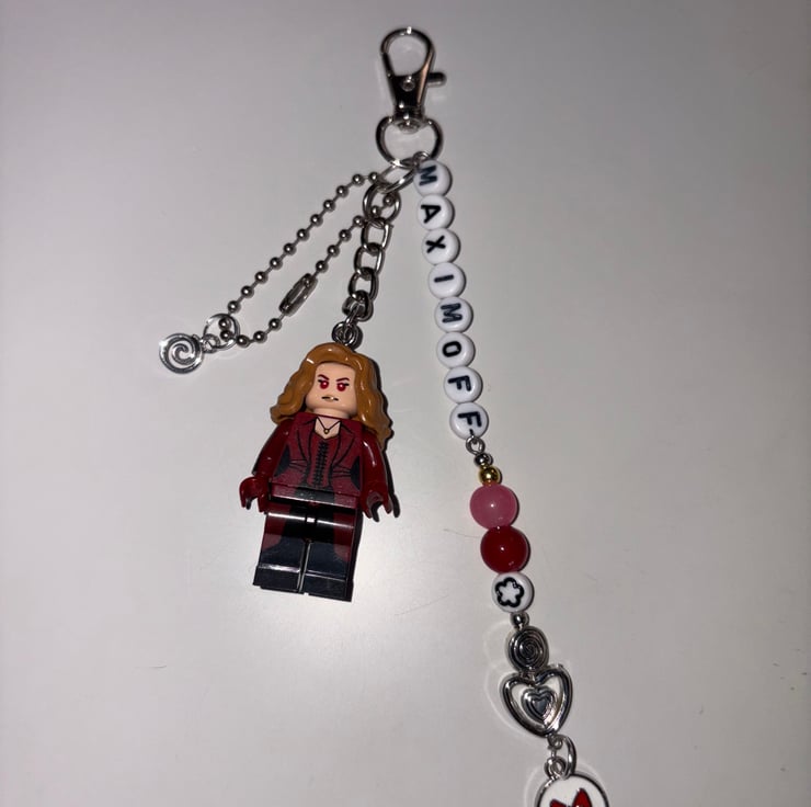 A handmade beaded and charmed the Scarlet Witch inspired minifigure keychain