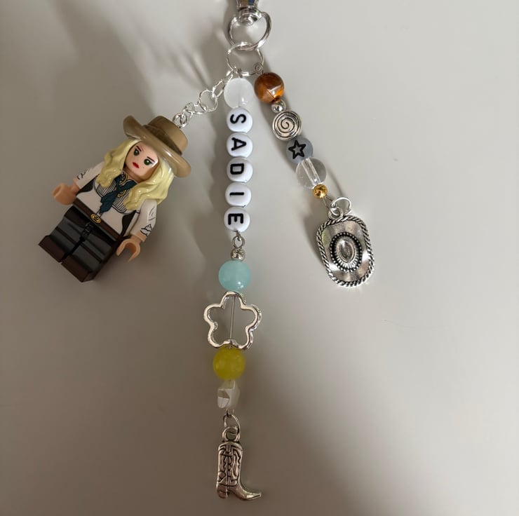 A handmade beaded and charmed Sadie Adler inspired Lego minifigure keychain