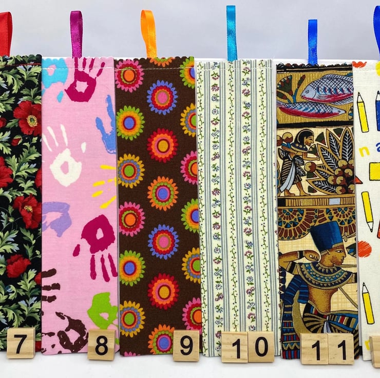 A collection of handmade cotton fabric bookmarks, each individually sewn and carefully finished with a coordinating ribbon.