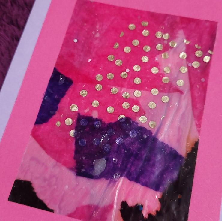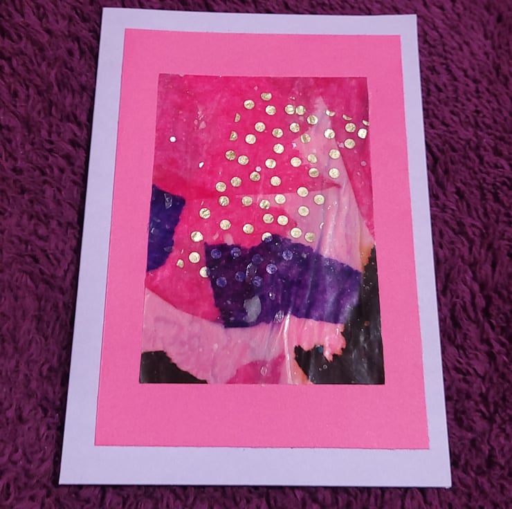 Handmade A6 blank card glossy tissue paper design includes the colours of purple, pink, black and gold spots. Design is made by gluing tissue paper onto a laminated surface and peeling it off creating a glossy design effect.