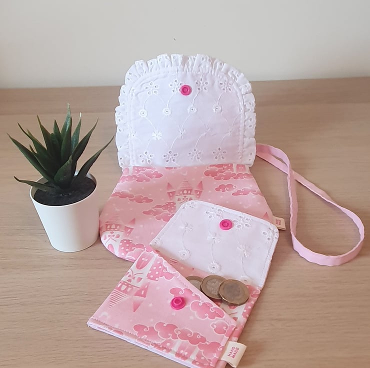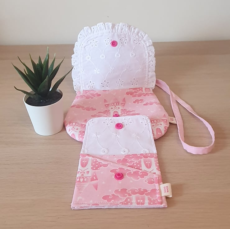 The bag features a broderie angalais white ruffle on the flap with a hot pink snap closure. This set includes a coordinating foldover purse with matching snap closure.