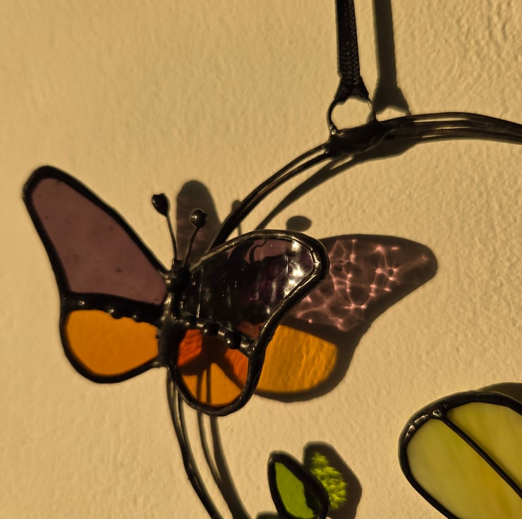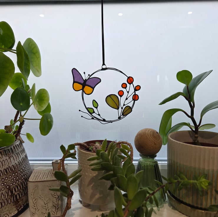 Folk Flower and Butterfly Stained Glass Mini Wreath  Wall and Window Hanging