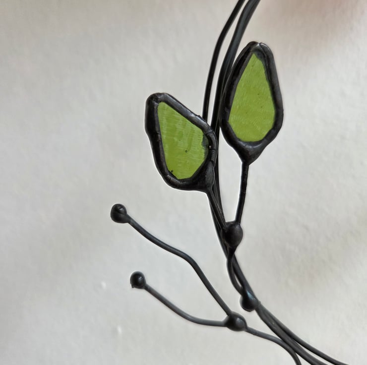 This mini wreath packs a punch of vibrant colour and would cheer up a boring window (think downstairs loo, or kitchen window!) but equally looks gorgeous hanging on a wall to fill in a little space that could use a little dose of joy. Hand crafted using the traditional copper foil method and finished with a black patina, this piece is true folk craft, earthy and honest.