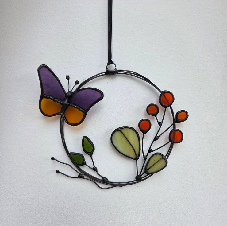 A sweet folk art handmade mini wreath that brings a tiny bit of summer into the home. The stained glass butterfly perches with wings at an angle on the wire hoop, while stems branch out into vibrant orange-red berries and soft yellow-green leaves, with small green buds that extend beyond the frame giving the piece a natural, organic botanical quality.