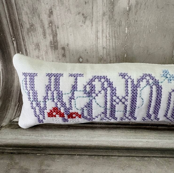 Bowl Filler machine embroidered cross stitch design. Measuring 6.5" x 2". White prewashed linen fabric filled with polyester fibrefill. Little pillows of fun. Select 1 or fill a bowl full of Spring colours.