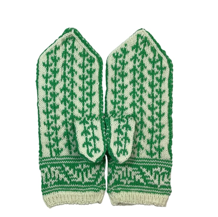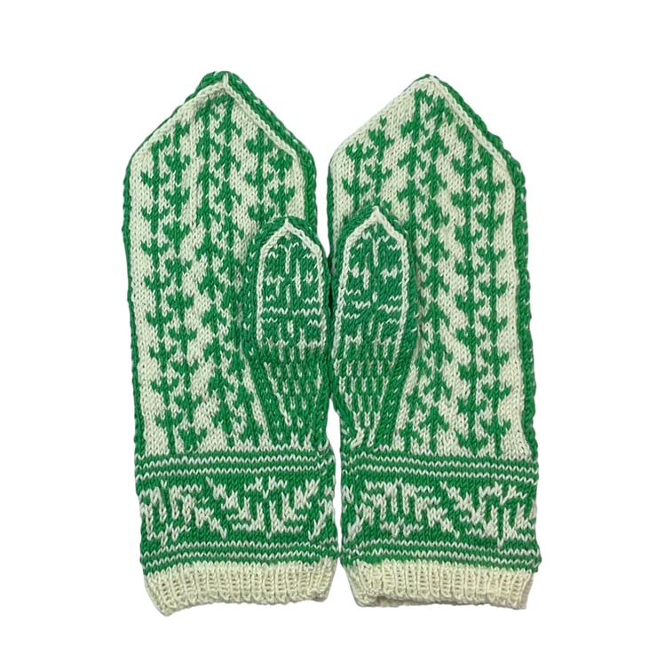 These beautiful mittens are in pure soft merino wool so perfect cold weather wear. A cute budgie sitting on a branch knitted in grass green a cream background is the centrepiece of the back off each hand. The stranding continues on the palm and the thumbs with an attractive bird footprint pattern. Below the budgie is a band of fern leaf pattern, and above is a snowflake type pattern, this pattern also continues on the thumbs.