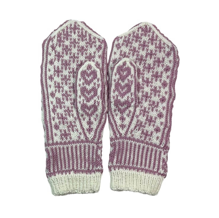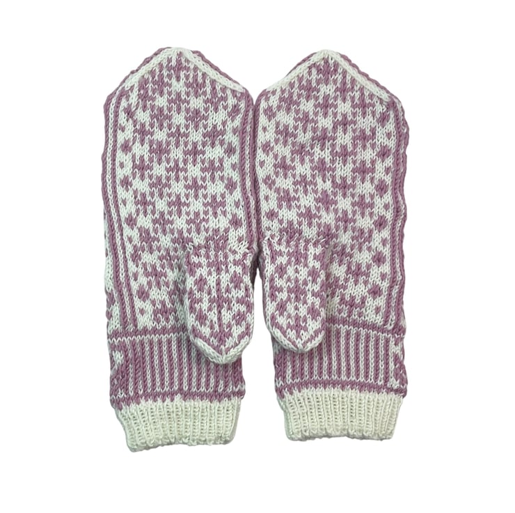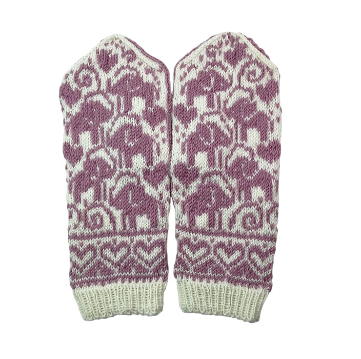 cute mittens for pink elephant lovers! These beautiful mittens are in pure soft merino wool so perfect cold weather wear. The main feature is the cute little elephants covering the entire back of thehand, with hearts just above the wrist.