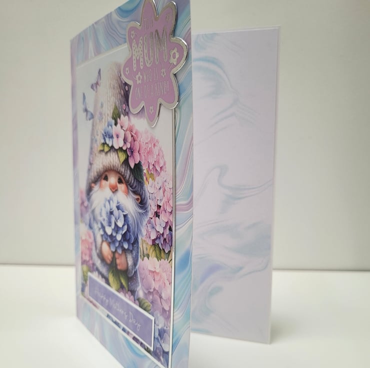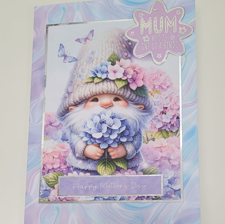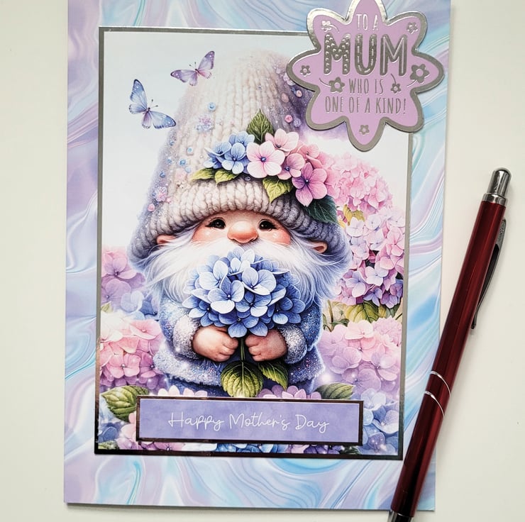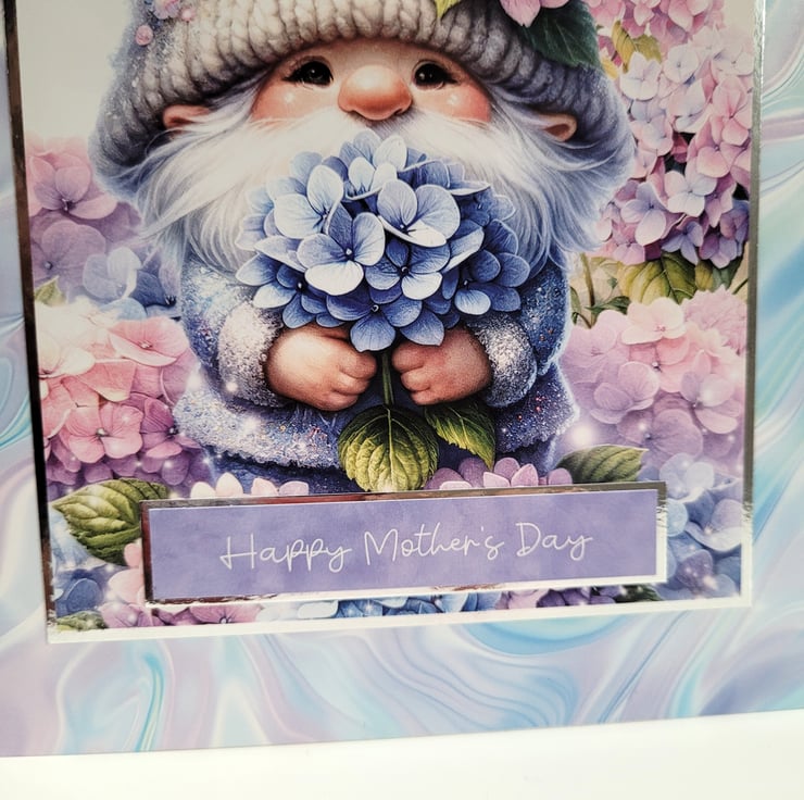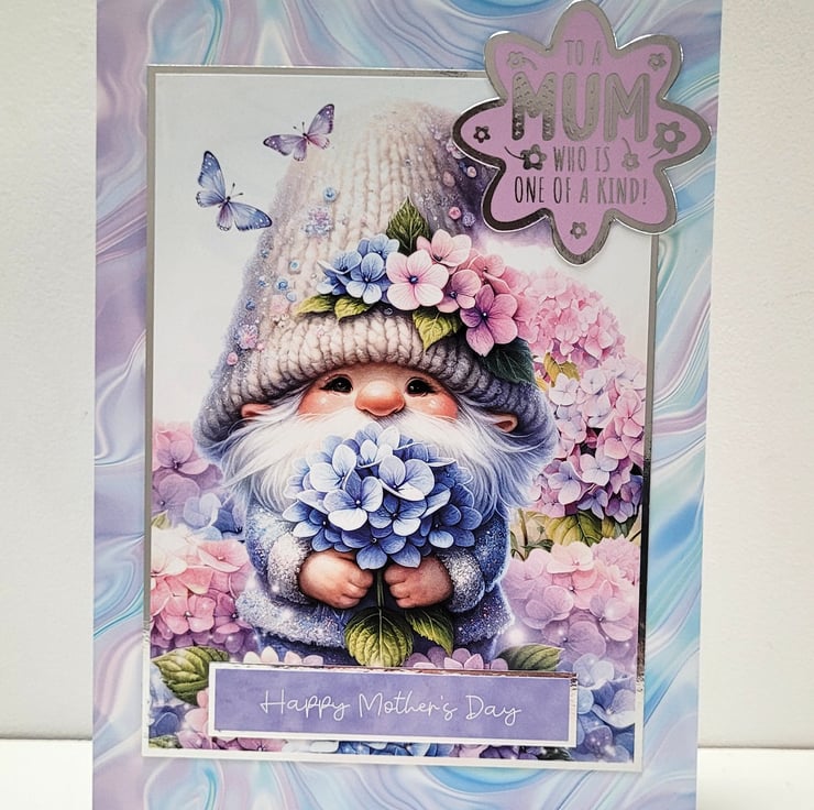 This adorable Mother’s Day card features a charming spring gnome holding a bouquet of blue hydrangeas, surrounded by soft pastel florals and butterflies. The marbled pastel background and layered design give this handmade card a beautiful feel that’s perfect for a mum who loves flowers, gardening, or whimsical art.