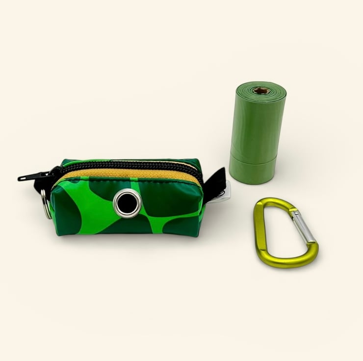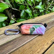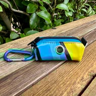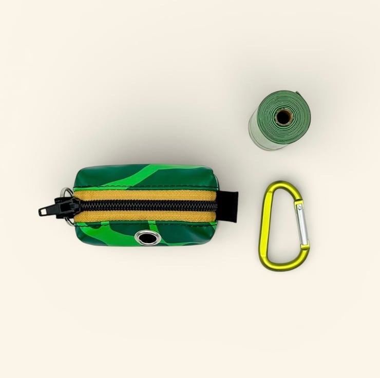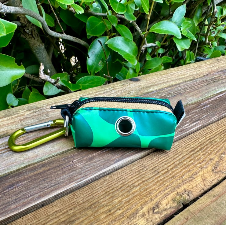 This dog poo bag holder is small, strong and weatherproof. It features an ‘auto lock’ zip, which is smooth to open and close but stops accidental unzipping. The bag is lined with scavenged canvas from a boat canopy. There is a metal opening for you to pull the bags through and a handy, sturdy karabiner clip.