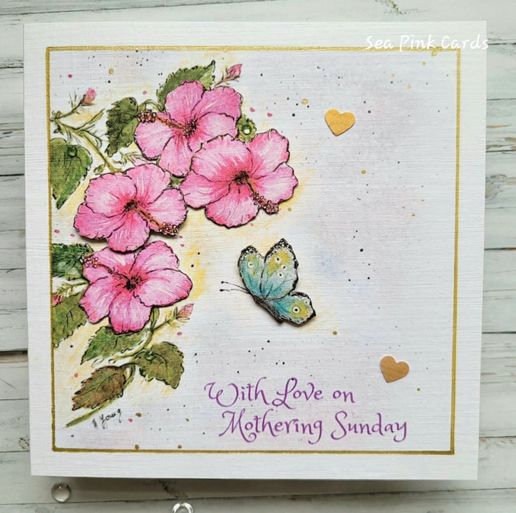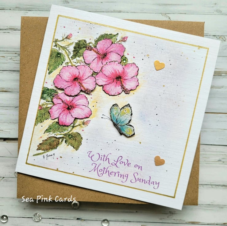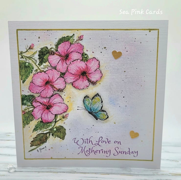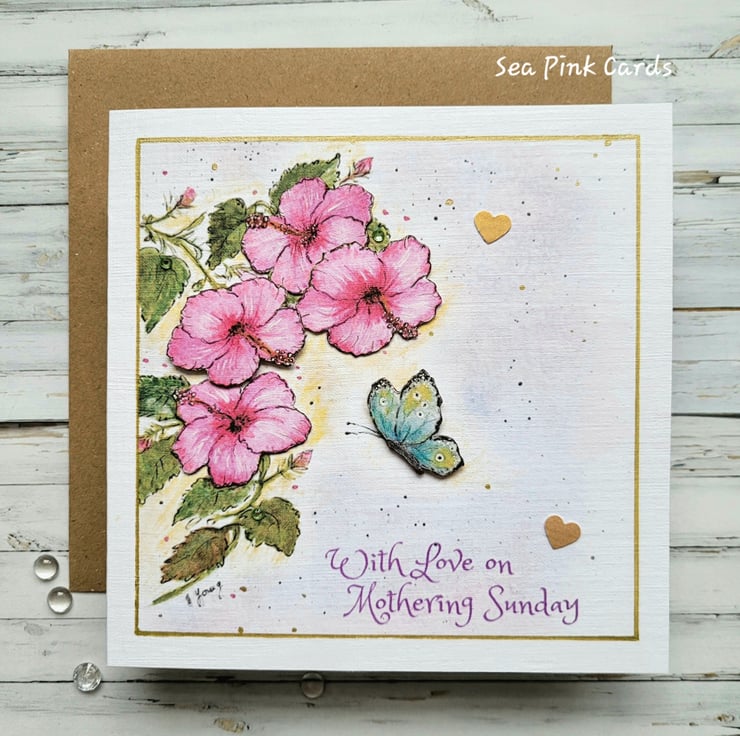 A special hibiscus and butterfly mothering sunday card that has been reproduced using my original artwork of beautiful hibiscus flowers and a butterfly in flight. A special card for mothering sunday with a lovely floral design and capturing the beauty of nature. The card has a finely textured finish and is on 100% recycled white linen cardstock. The flowers are dimensional and the butterfly has also been decoupaged. Blank inside for writing a personal message and hand-finished with subtle shimmer pen, gold metallic pen and 3 little crystal embellishments.