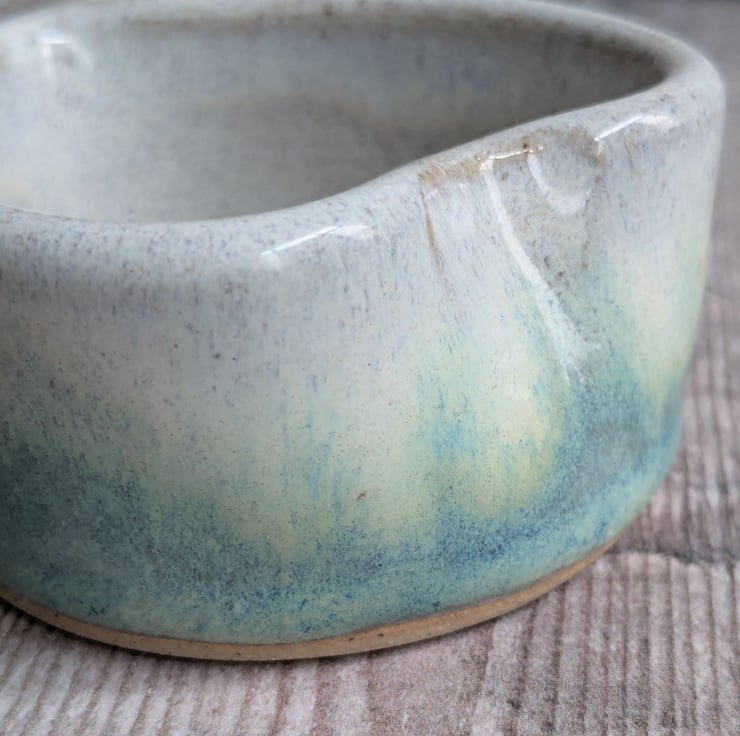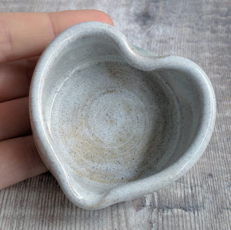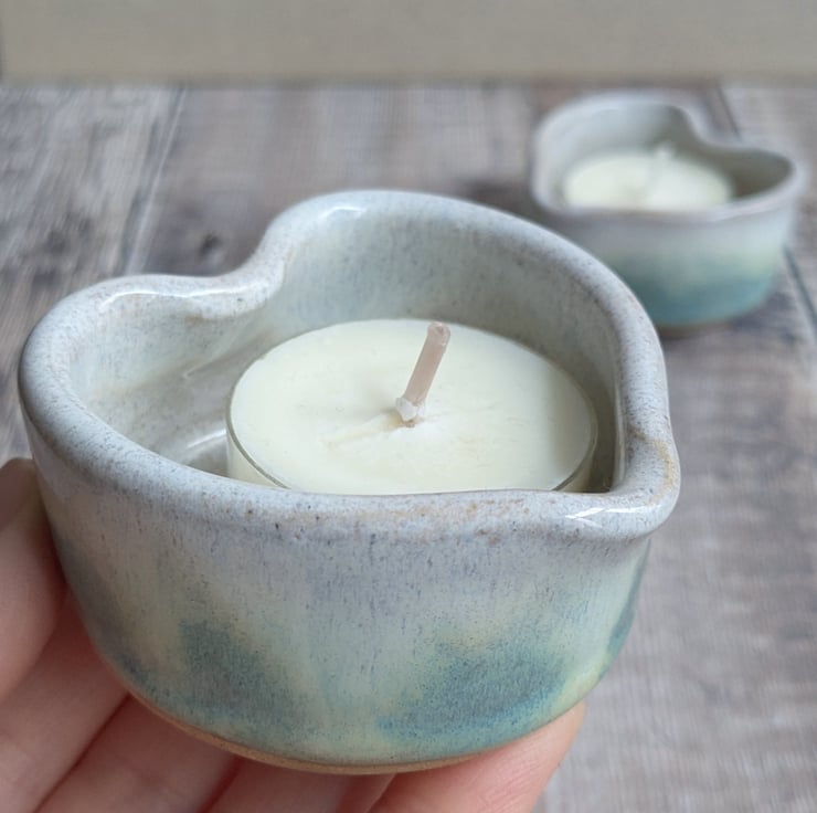 Two ceramic tealight holders wheel thrown from a buff stoneware clay and shaped into a heart. The glaze is a soft white fading into turquoise with variations across the surface where it's thinner. They each measure about 6cm wide and 3cm high. (Candle is not included).