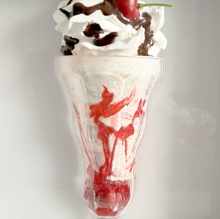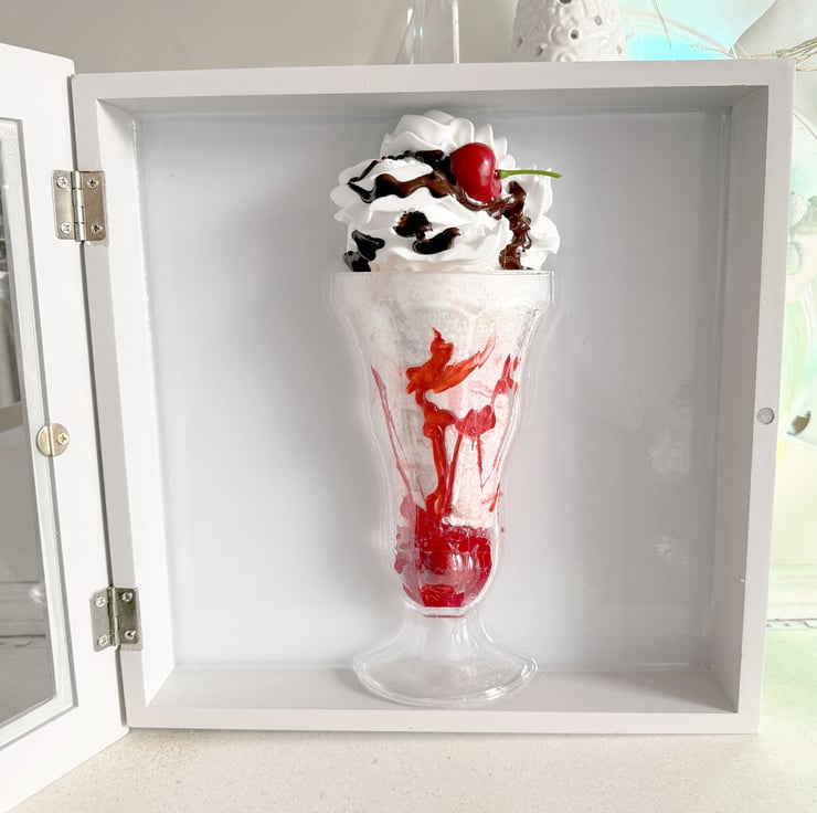 Fake Food Art classic American Diner Knickerbocker Glory embedded in a resin backed window box frame with door.