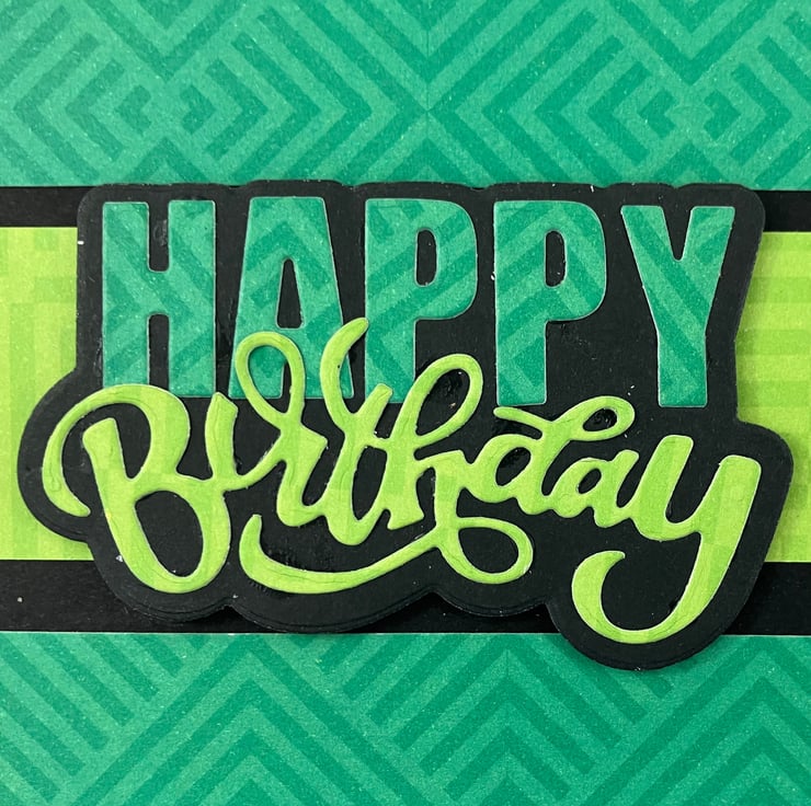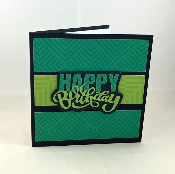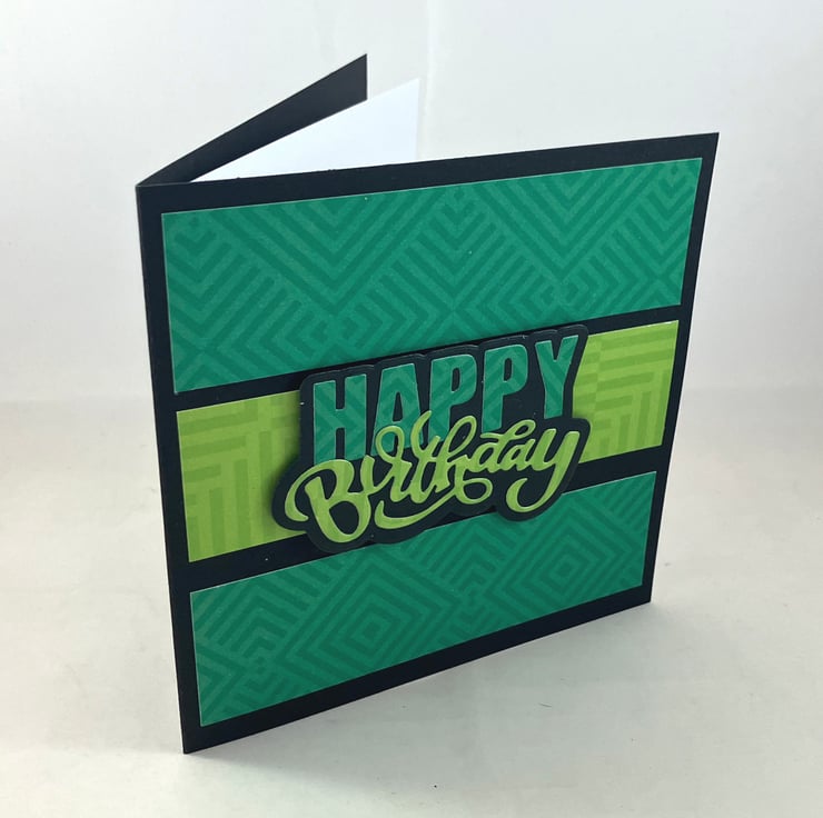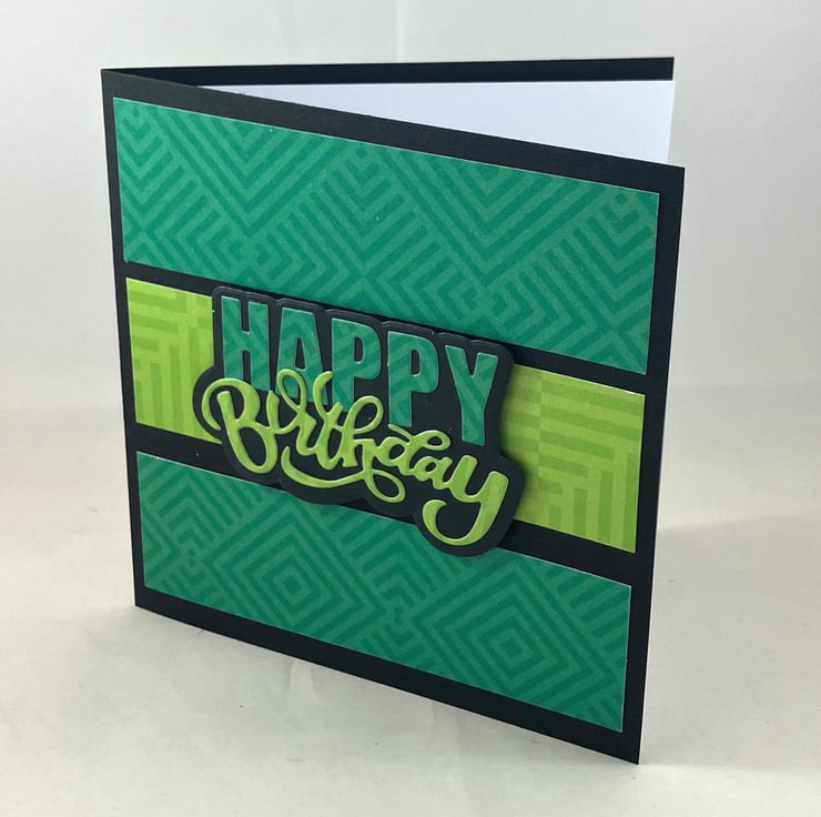 Square birthday card featuring a die cut Happy Birthday sentiment in two shades of green overlaid onto three strips of the same cardstock, on a black card base.