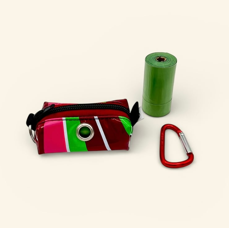 This dog poo bag holder is small, strong and weatherproof. It features an ‘auto lock’ zip, which is smooth to open and close but stops accidental unzipping. The bag is lined with scavenged canvas from a boat canopy. There is a metal opening for you to pull the bags through and a handy, sturdy karabiner clip.
