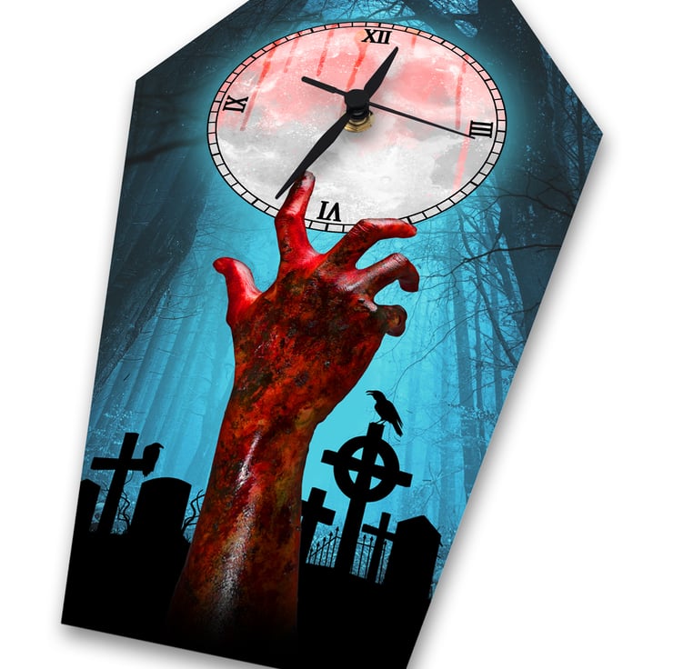Choose from 5 unique coffin designs for your hand made clock: Spirit board, black roses, biker, zombie hand and tarot or I can print your own design or photos onto the clock.