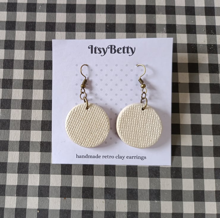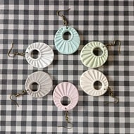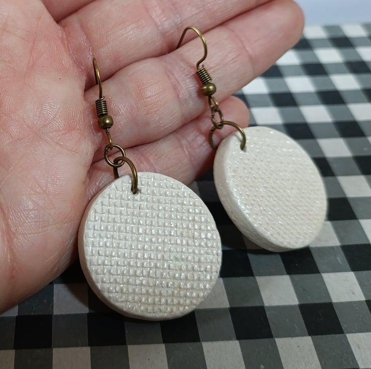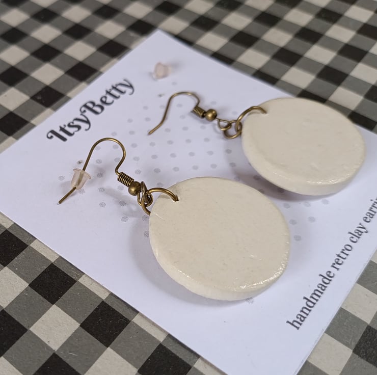 These earrings are crafted from air dry clay, then hand painted and varnished. Completed with antique bronze effect ear wires and plastic backs.