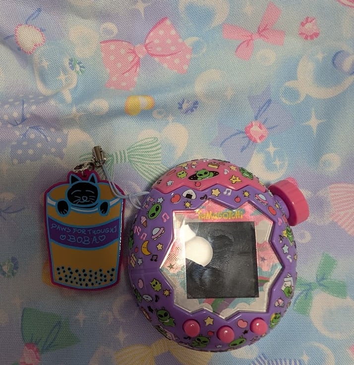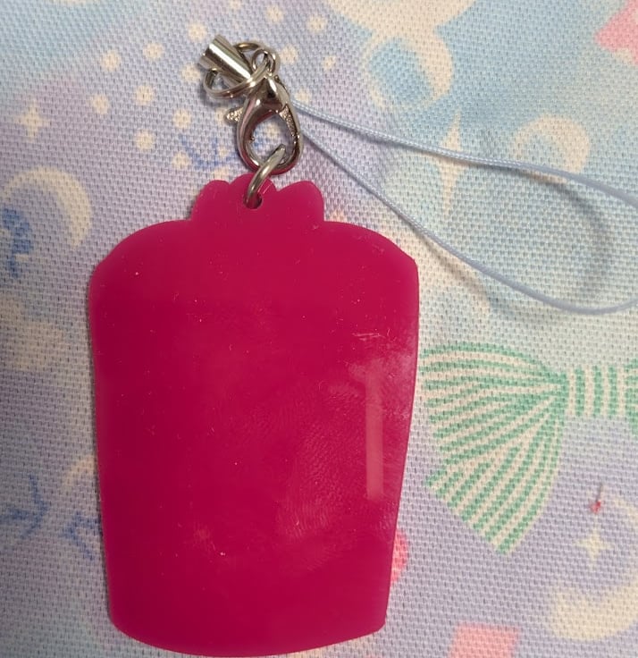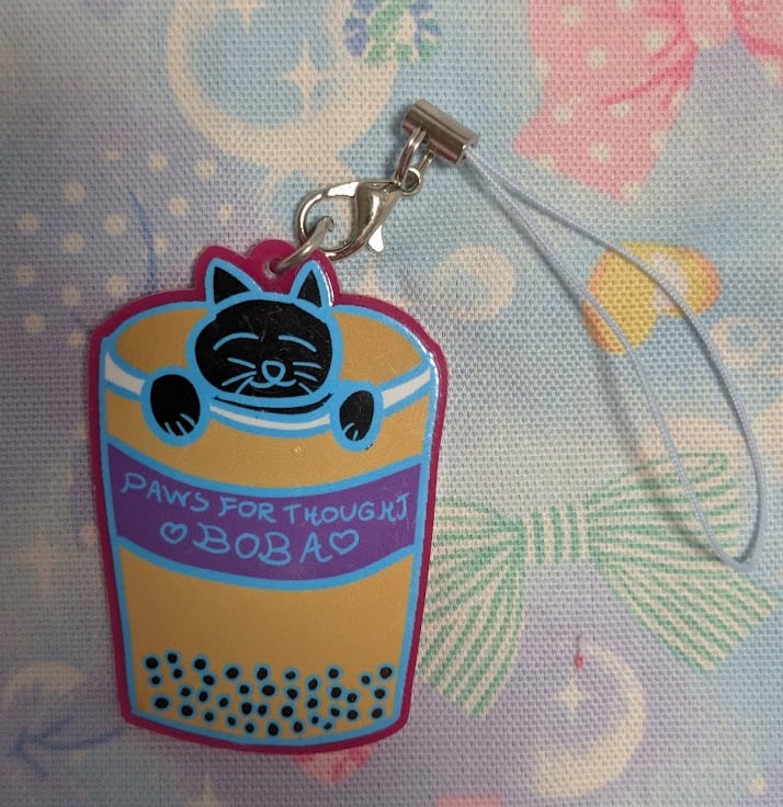 A black cat sits in a boba tea cup adorned with the phrase "Paws for Thought Boba". Consists of bright acrylic in Pantone 225c with a pale blue strap. Has a glossy finish and a plain back. Item displayed is a sample - actual product has peelable protective covers. Produced for me by Zap Creatives.