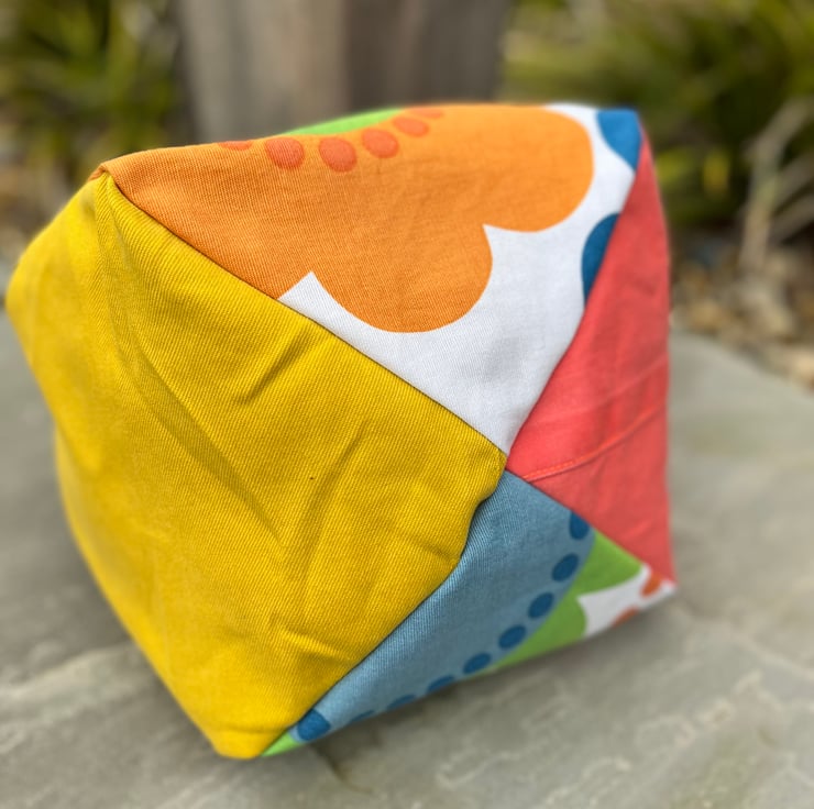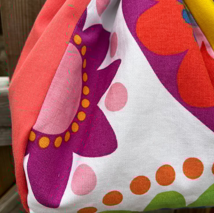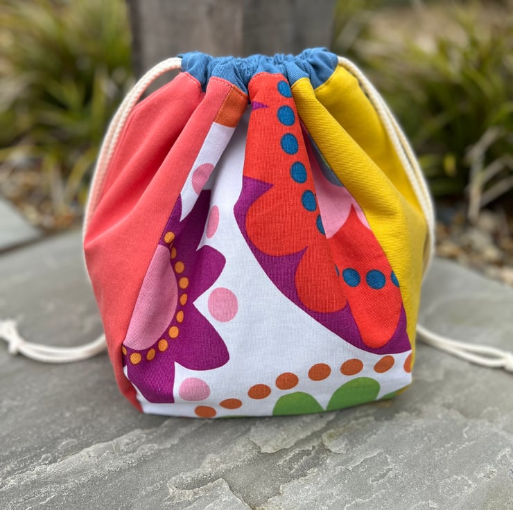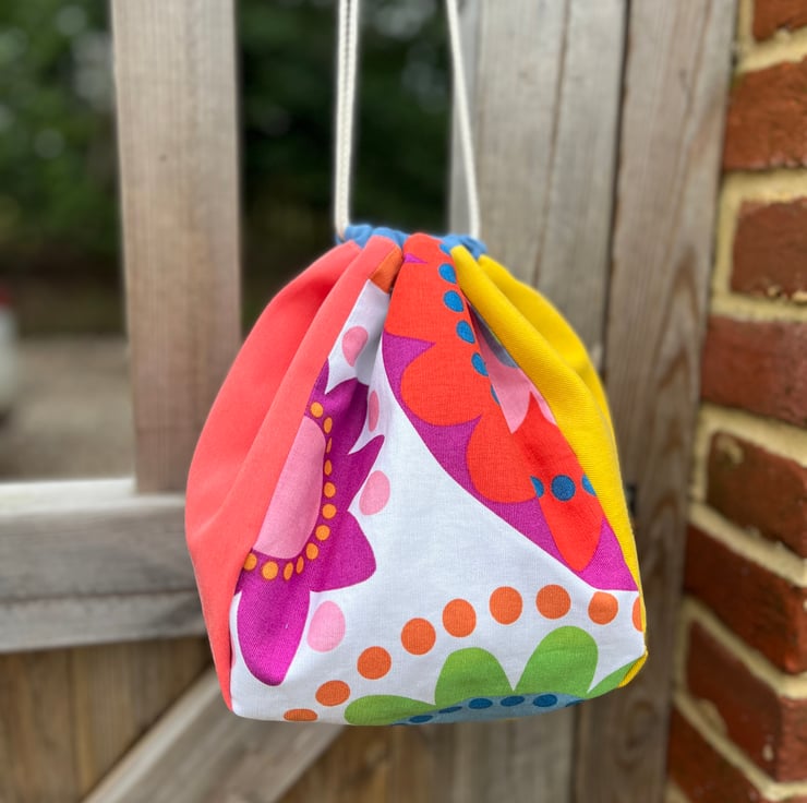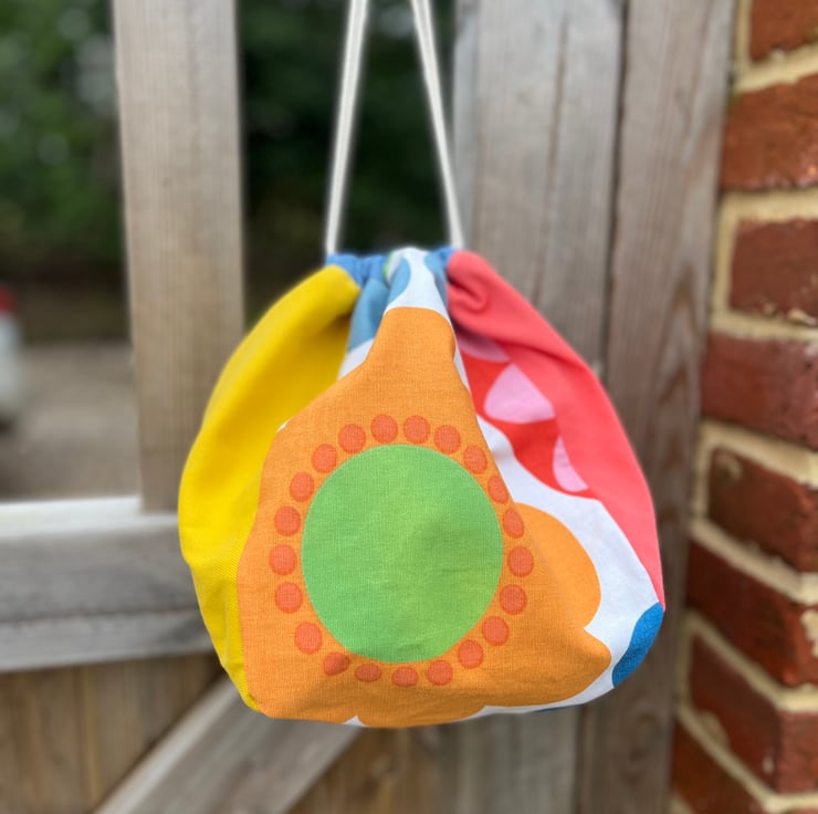 Plump drawstring bag made from discontinued Ikea Fredrika cotton and bright plain sample swatch fabric. It’s fully lined with plain yellow fabric also taken from sample swatches which were waste from the fashion industry.