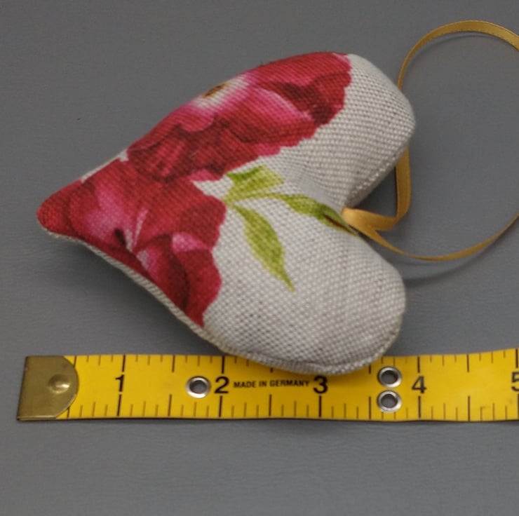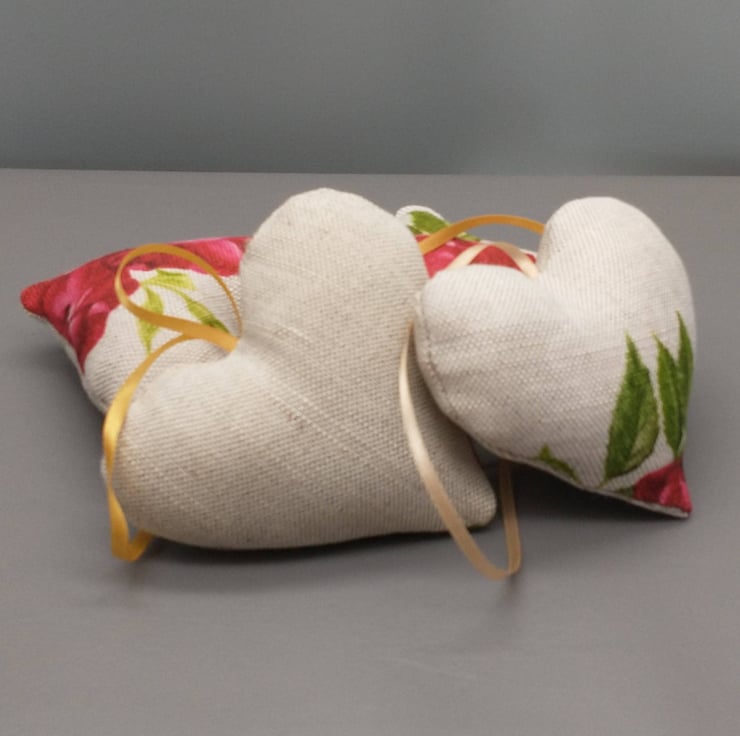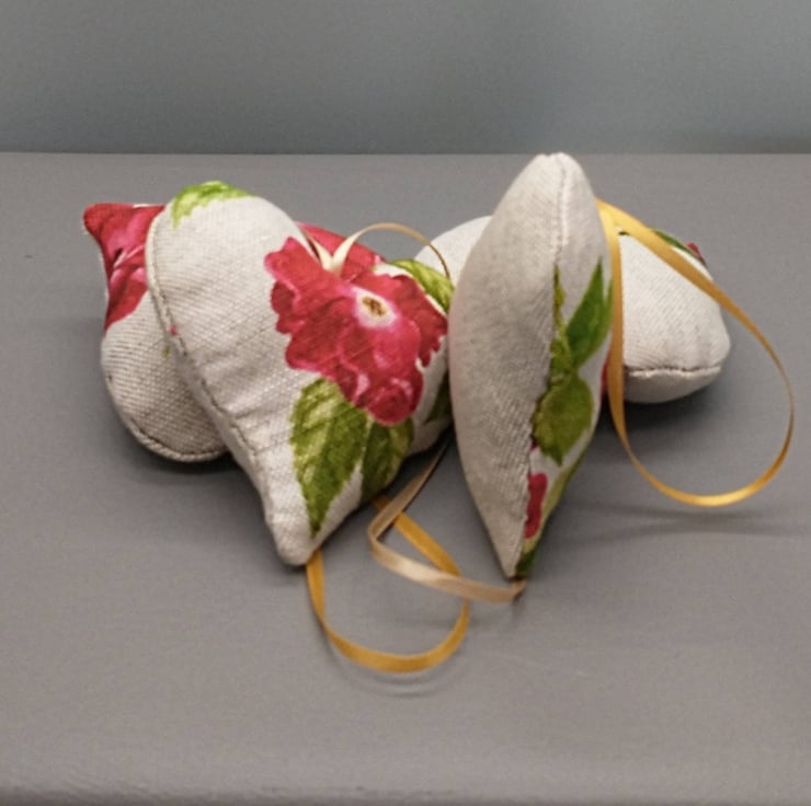 Lavender filled heart sachets made from our own Red Rose design on linen union with a co-ordinating ribbon for hanging in your wardrobe.