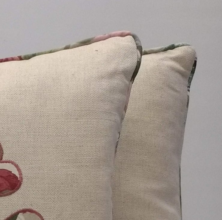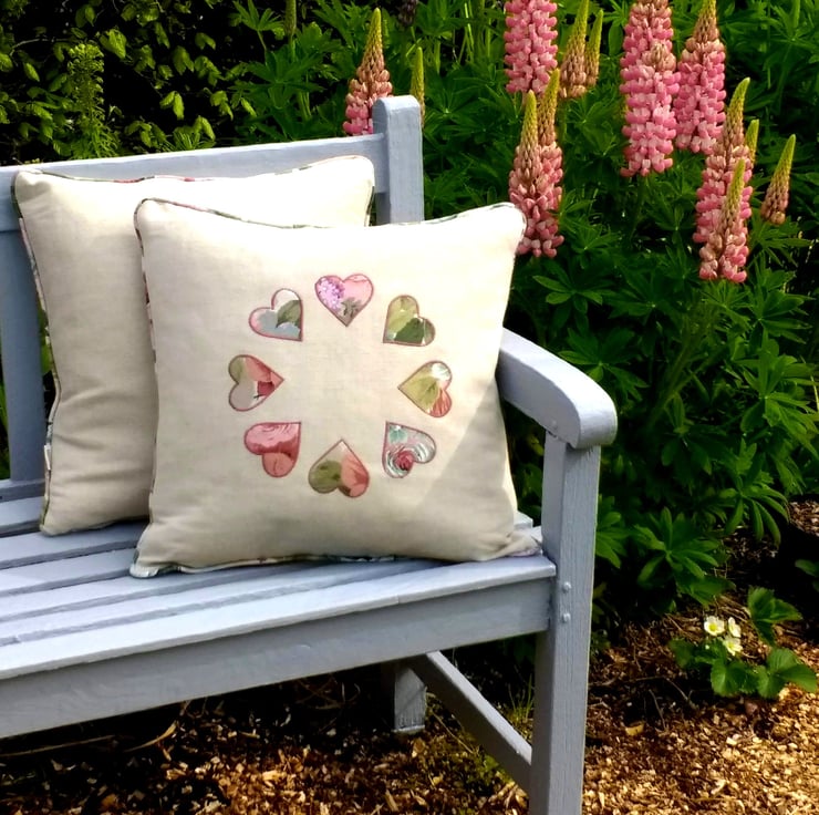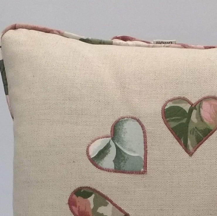 Handmade square cushion with floral cotton hearts appliqu d onto an oatmeal coloured linen union with a corresponding cotton piping. Each cushion measures approximately 18" x 18", has a plain linen union back with a discreet zip closure and comes filled with a polyester pad.