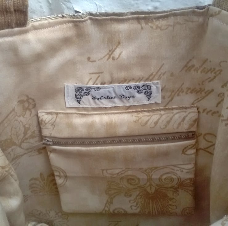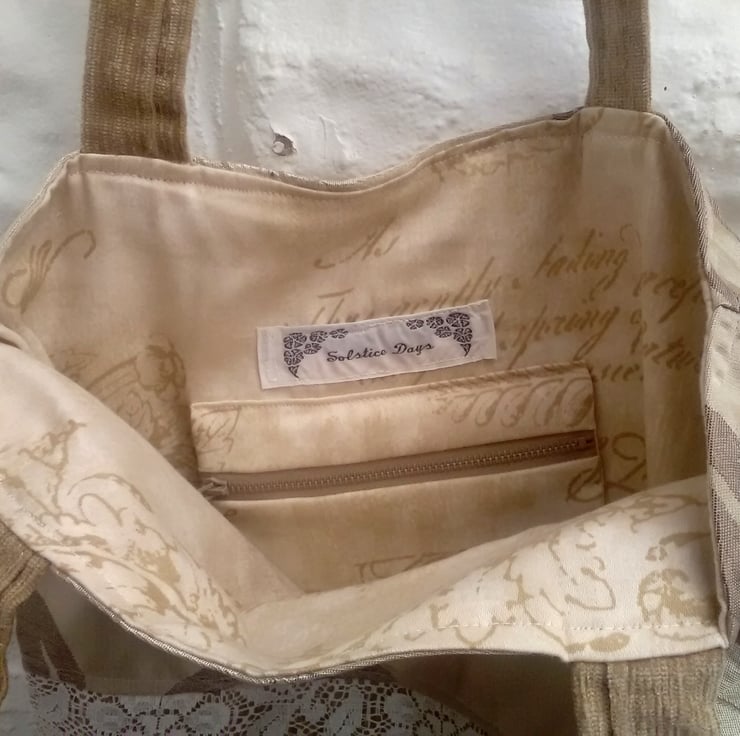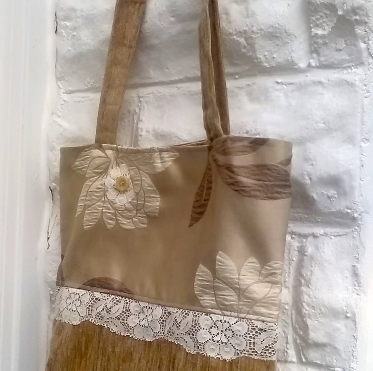 Brocade fabric in a flower design with a cream lace flower and cream button detail to the front of the bag, with top-stitched straps and top stitching around the edge