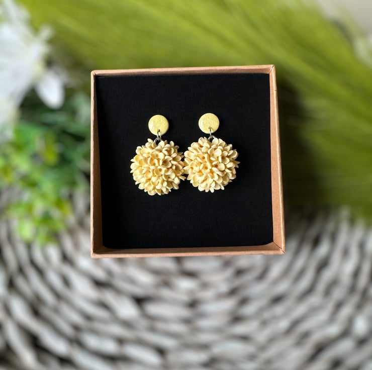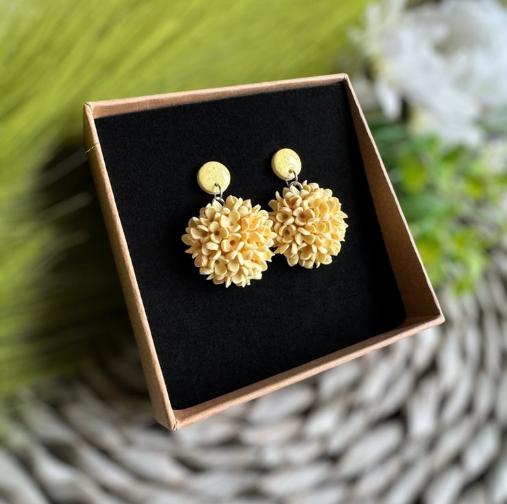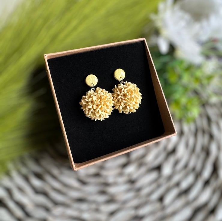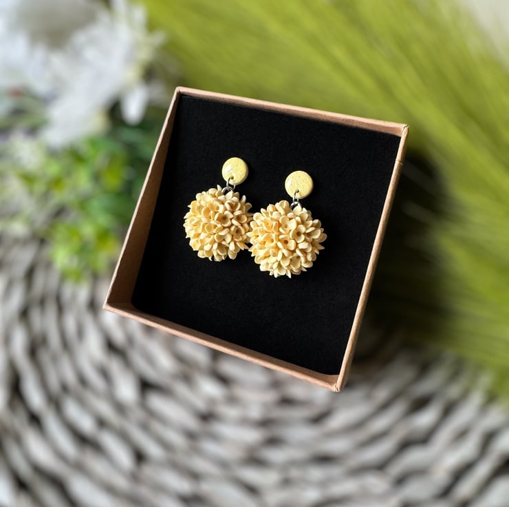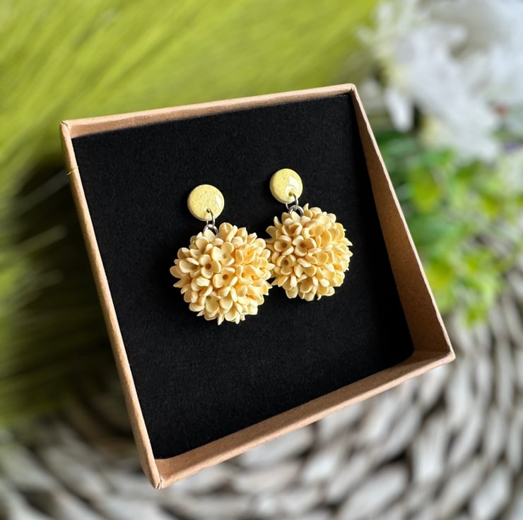Mixed Pastel Yellow polymer clay, cut and shaped into individual little flowers to create a full bloom Hydrangea style flower earrings.
