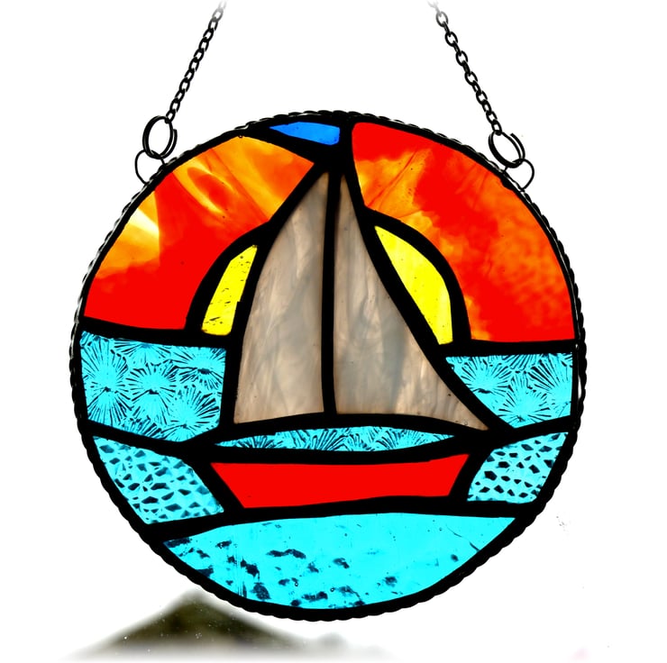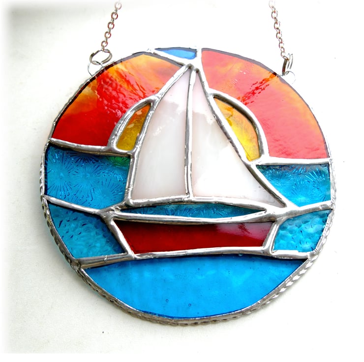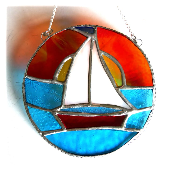 Sailboat Sunset Stained Glass Suncatcher Handmade Ring 030