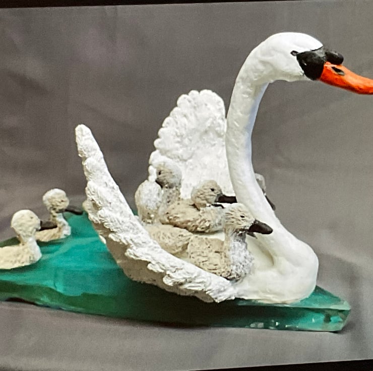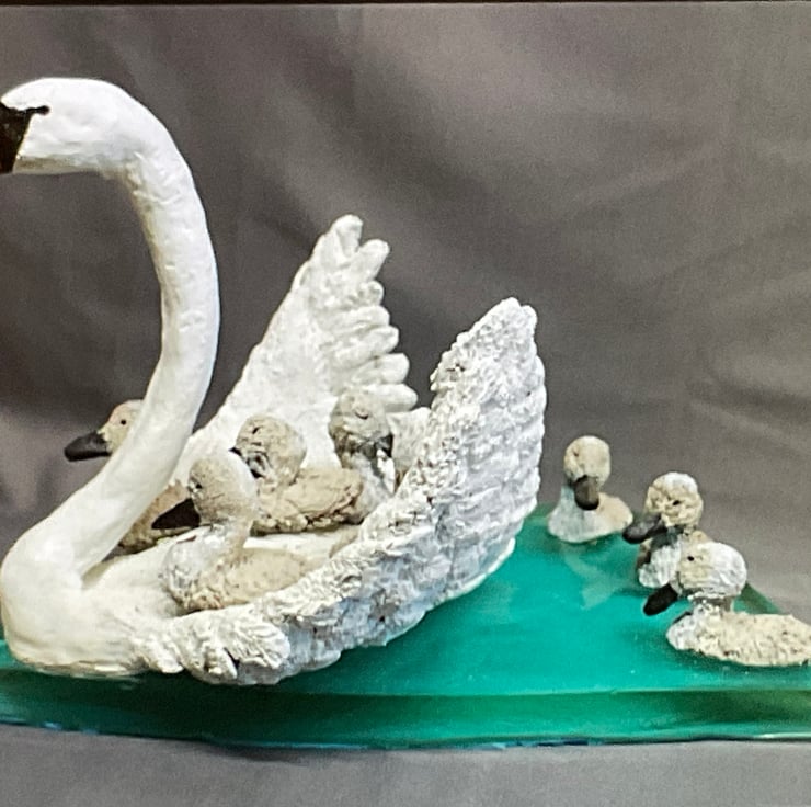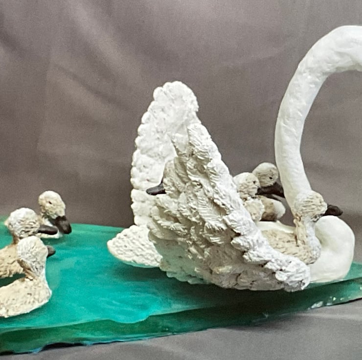 A Swan and Cygnets swimming on a vintage glass base with blue baize to show through the glass as water and to protect your surfaces,